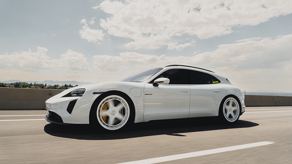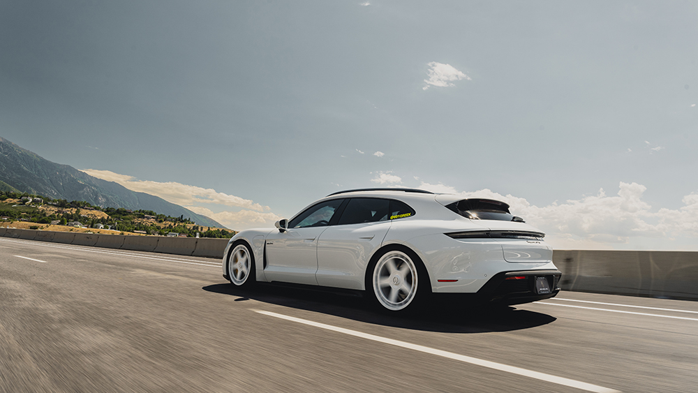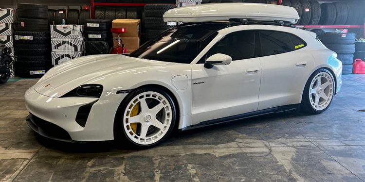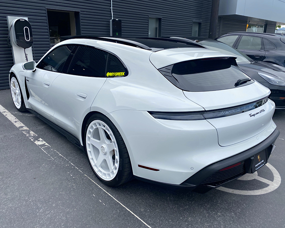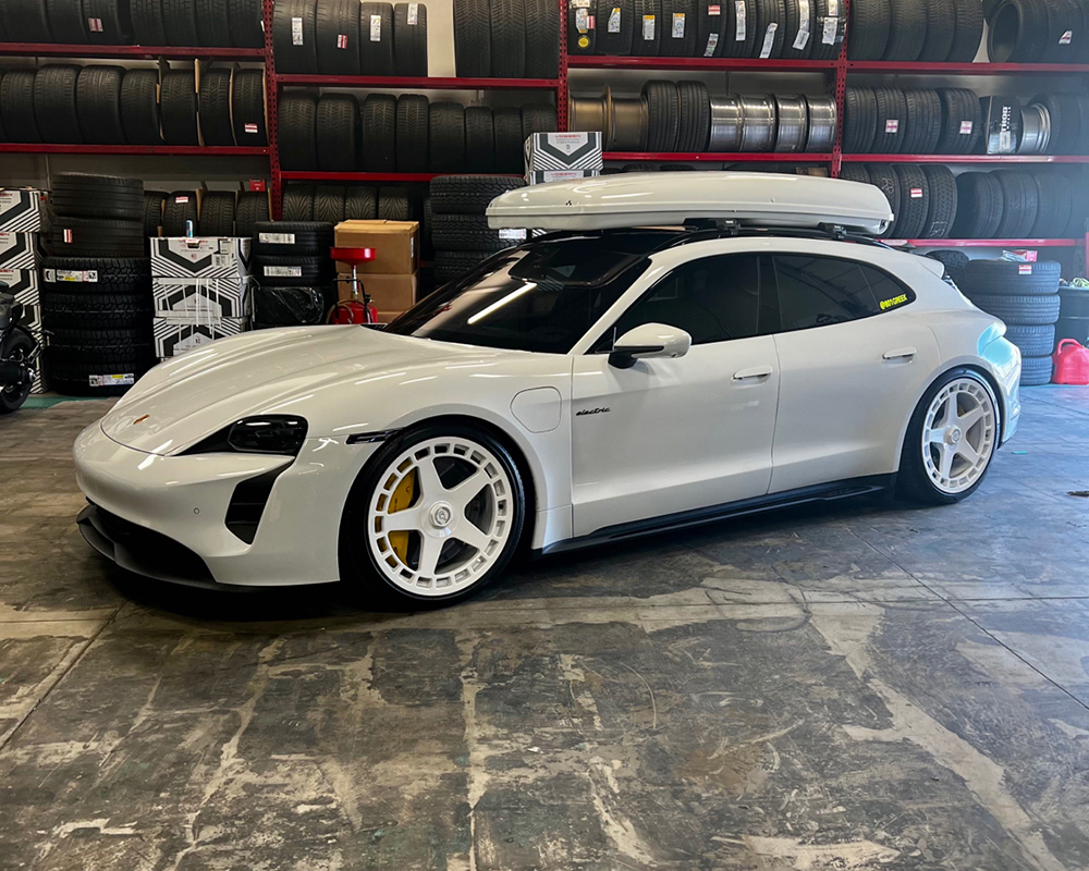 This beautiful Porsche Taycan Cross Turismo features VR Forged D12-R forged wheels. This wheelset is a high-performance option that provides the driver with an unmatched driving experience and a rally-inspired finish. It is made of forged aluminum and finished in a gloss white color. The wheel has a diameter of 21 inches and a width of 9.5 inches, and it is fitted with a 5×130 center nut cap. The VR Forged construction ensures that the wheel is strong and durable, while the gloss white finish gives it a look that is both modern and cutting edge. The center cap is also glossed white, adding an extra level of sophistication to the overall look of the wheel.