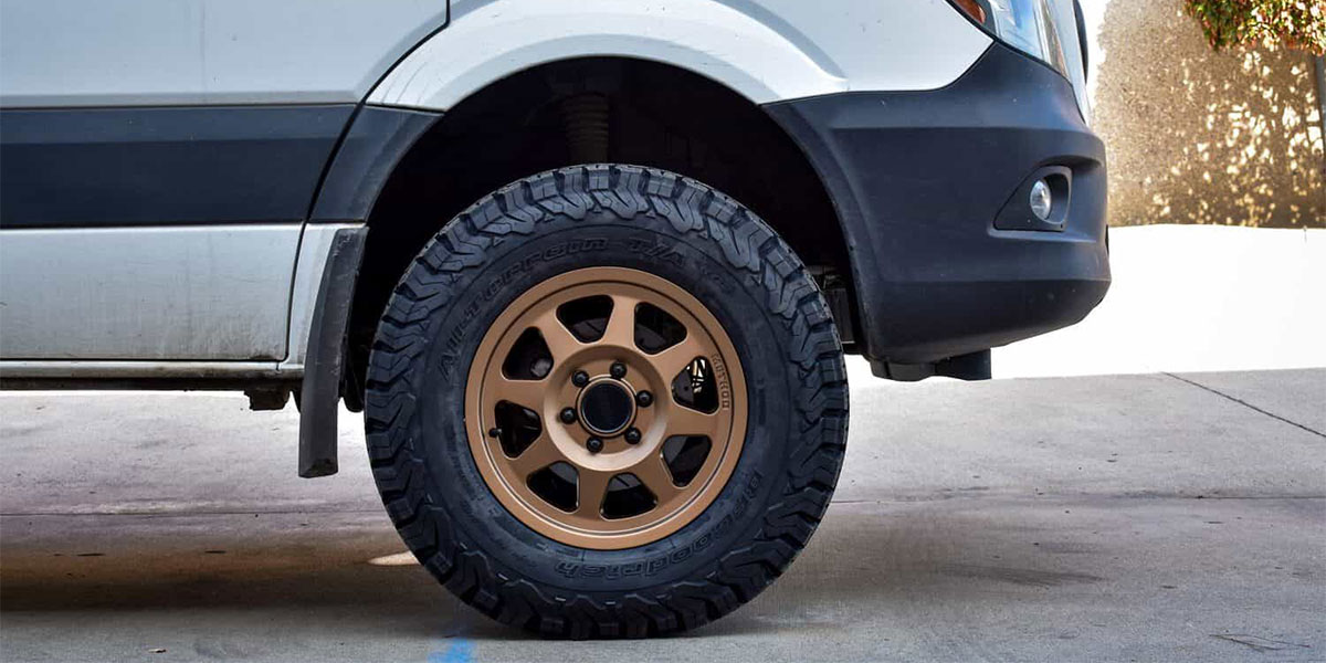 As you probably know, the factory wheels and tires on Sprinter vans are very small and boring. The tires are designed for extremely basic road usage and provide minimal off-road traction and many of them are limited as far as total load. With or without a lift kit on your Sprinter, tires can make all the difference for on-road and off-road traction.