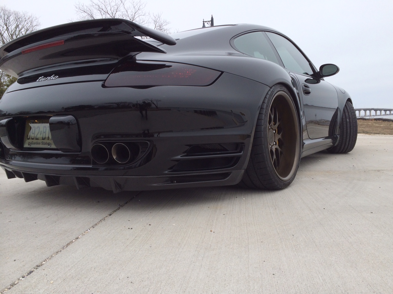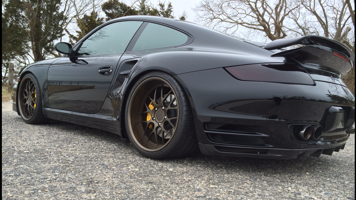 This is a super hot Porsche 997 Turbo. Our customer Steve has his 997 murdered out on the lights and body but then threw a curveball with these sick 19 inch deep lip bronze wheels. Full bronze centers with bronze lip on the 911 looks amazing. He also dressed up his Turbo with an Agency Power carbon fiber rear diffuser and some carbon decklid scoops. We don’t have the full mod list but you can tell its been lowered, has some quad exhaust tips and I bet is fast as hell! Steve had to say this about us…