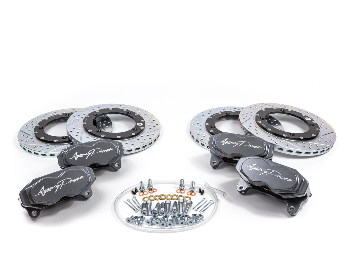 The Agency Power Big Brake Kit is sold as a 4 wheel brake system only. It is designed to be used on 15 inch wheels. We have tested the fitment of the brakes with common wheels such as Method Race Wheels in both a 0mm and 13mm offset as well as Fuel Wheels 38mm offset. The brake kit will not clear the stock 14 inch wheels. It is available in many different color options. Kits include a 1 year manufacture warranty against defects. Replacement and consumable parts are available.