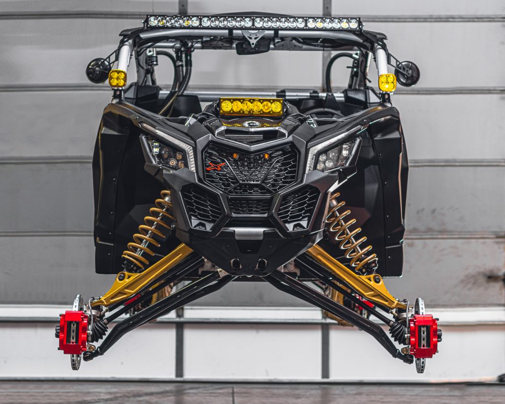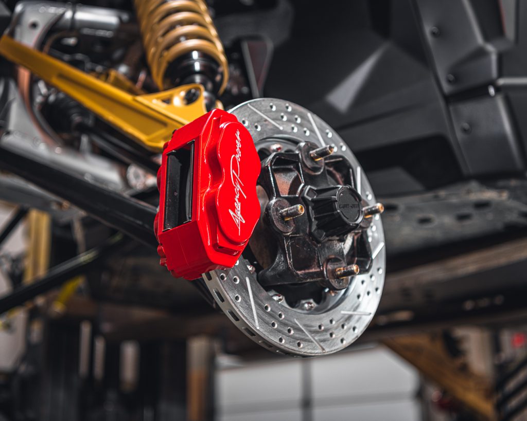 All brake components are manufactured right here in the USA in conjunction with one of the leading performance brake manufactures. This brake system was designed specifically for the Can-Am Maverick X3. With our nearly yearlong testing of different braking concepts and products on the market, we found it absolutely necessary to do a 4 wheel brake kit. With the engine in the rear and how off-road suspension works, typical automotive designs will not produce the improved braking performance the X3 needs. Our calipers are a 2 piece construction that has built in “ears” to mount to the wheel carrier. Removing the need for additional brackets and spacers like other companies may use, gives the Agency Power caliper an extremely rigid advantage. Each caliper half is assembled using 4 10mm cross bolts for maximum stiffness. Other products on the market only use 3/8 inch hardware which is not adequate. This rigidity eliminates caliper flex from hard pedal pressure or the potential of pad knock back.