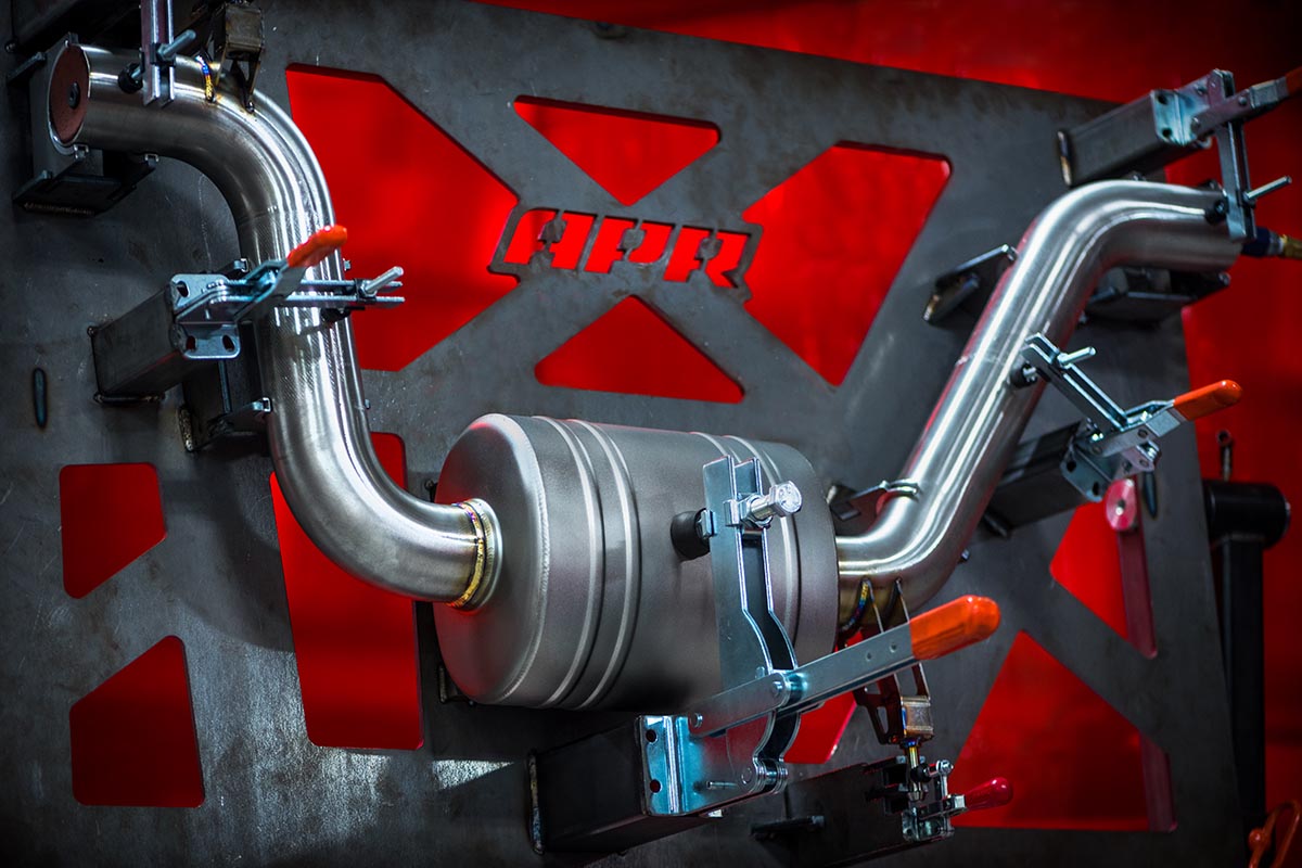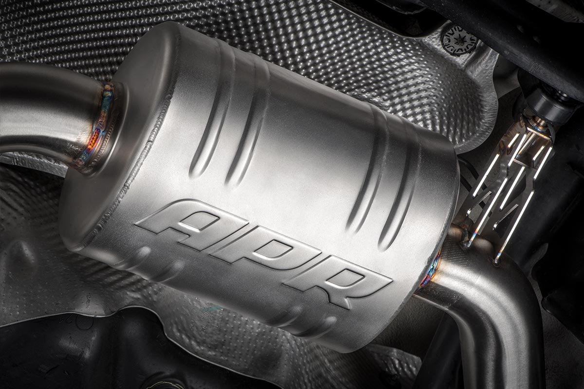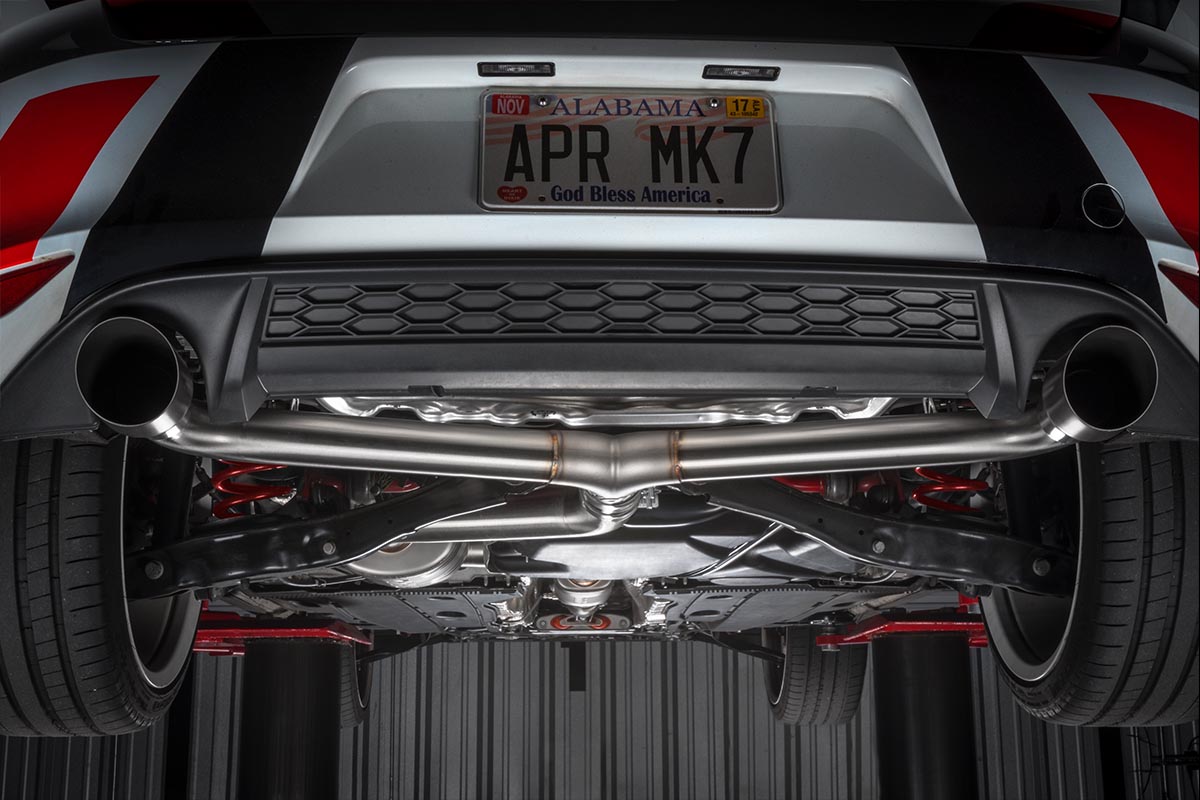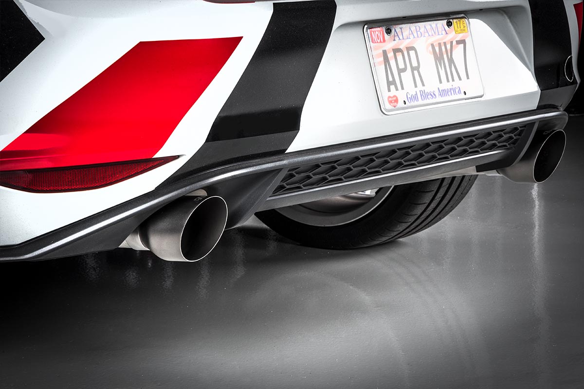 APR developed a catback exhaust system for the 2019-2020 Volkswagen GTI and GTI TCR to let the turbocharged 2.0L engine expel exhaust fumes efficiently. Constructed of T304 Stainless Steel, the exhaust system uses 3″ diameter tubing that splits to dual 2.5″ tube to mount the two 4″ tips. Featuring an ultra-smooth cast collector for the Y-section, the exhaust is precision mandrel bent to fit tight against the underside of the car making it suitable for lowered cars.