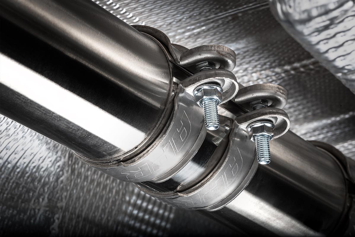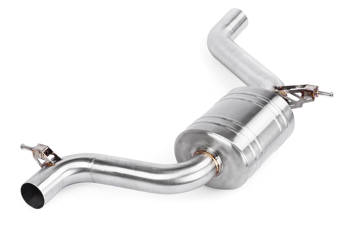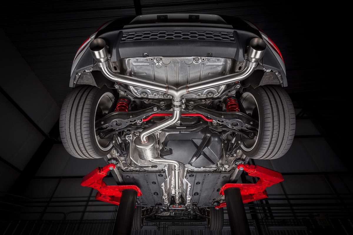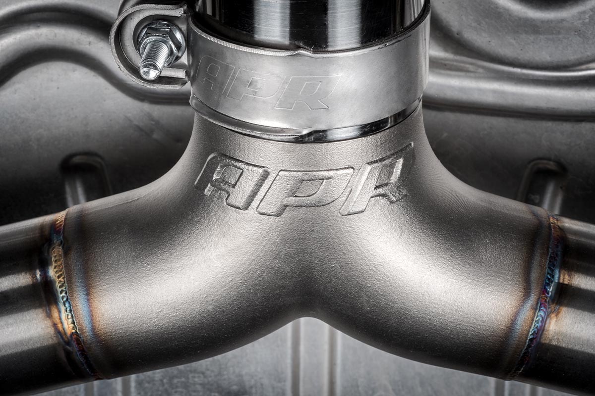 APR developed a catback exhaust system for the 2019-2020 Volkswagen GTI and GTI TCR to let the turbocharged 2.0L engine expel exhaust fumes efficiently. Constructed of T304 Stainless Steel, the exhaust system uses 3″ diameter tubing that splits to dual 2.5″ tube to mount the two 4″ tips. Featuring an ultra-smooth cast collector for the Y-section, the exhaust is precision mandrel bent to fit tight against the underside of the car making it suitable for lowered cars.