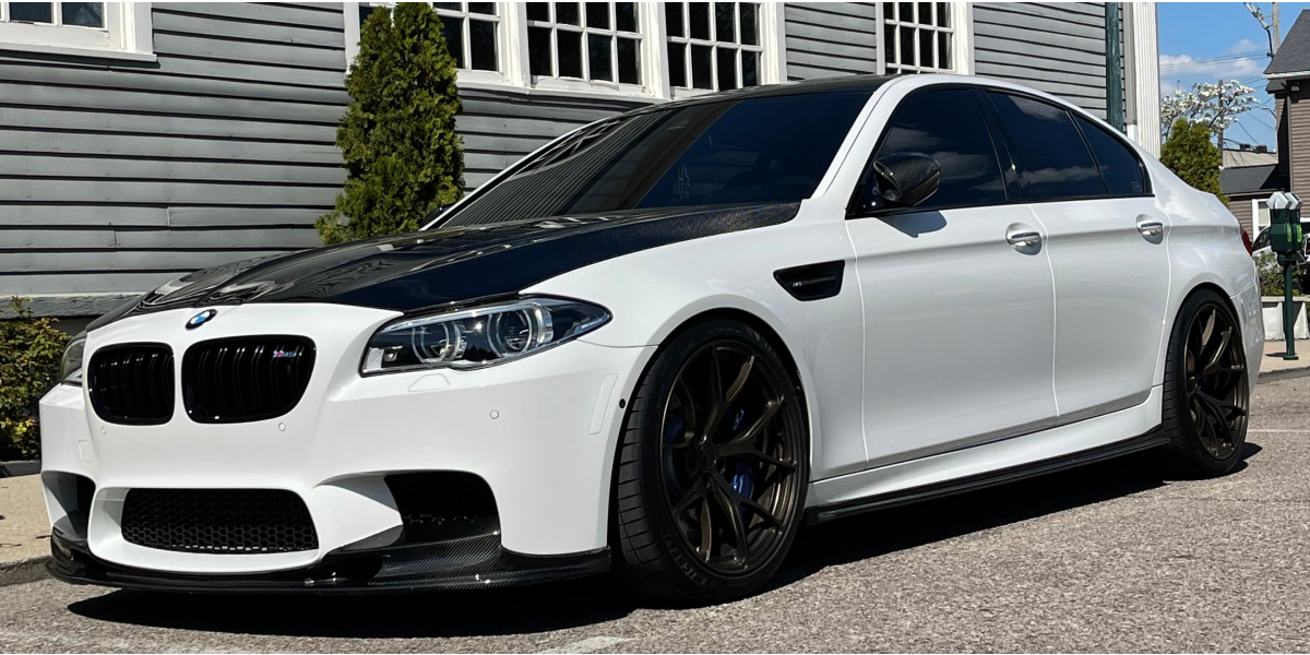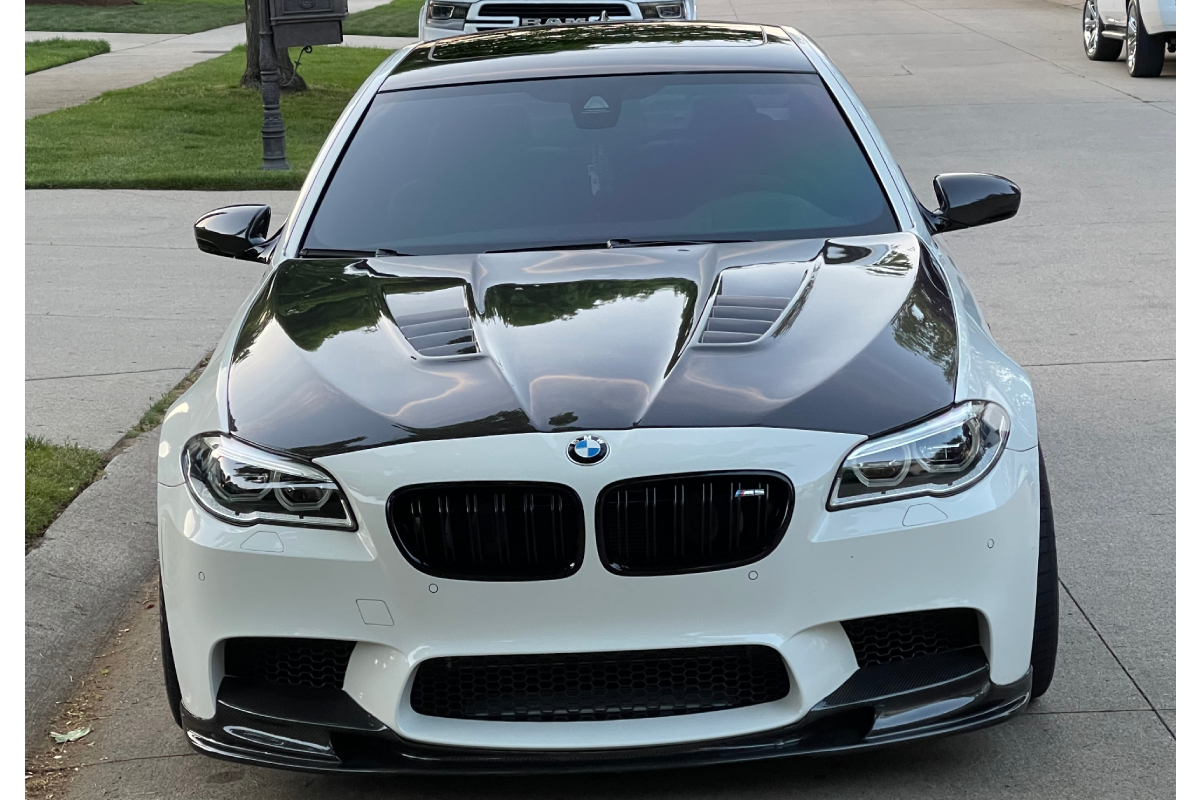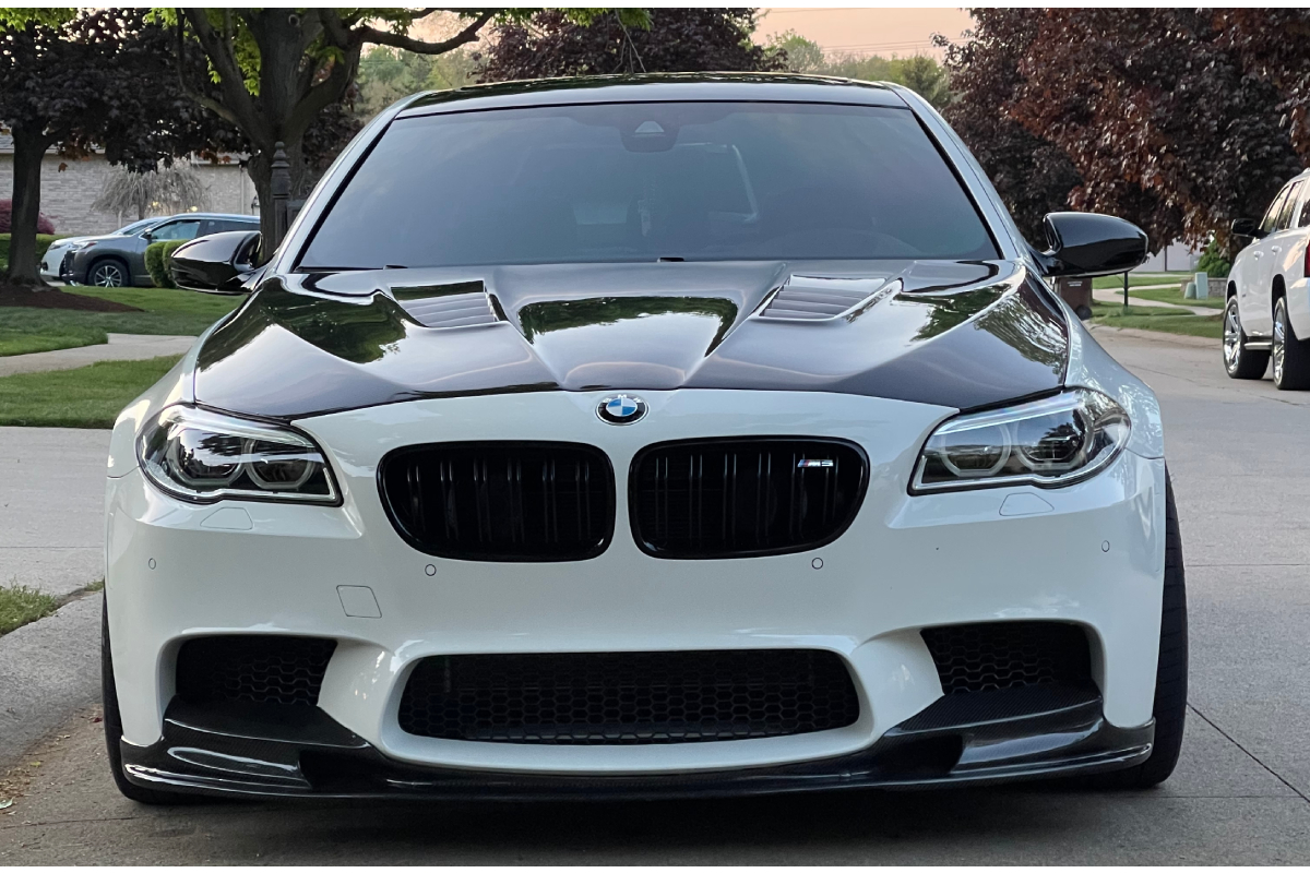 The BMW F10 M5 boasts a sleek four-door sedan design that attracts enthusiasts while still blending in with other cars on the road. Some, however, would like to stand out a little more and set their vehicle apart from the rest with some personalized mods. Luckily, BMWs are known for their “modability” and the automotive aftermarket houses a virtually endless array of products to make your M5 more “you.” Our customer, Radi Slantchev (IG: @F10_m5ntal), chose to amp up the exterior with Vivid Racing’s very own Aero DTM Style Carbon Fiber Hood. Radi tells us that his 2016 BMW F10 M5 is a DME stage 4 full bolt-on car. He also says that it’s currently the fastest stock block FBO BMW F10 M5 in North America – did 171.58 mph in the standing half-mile.