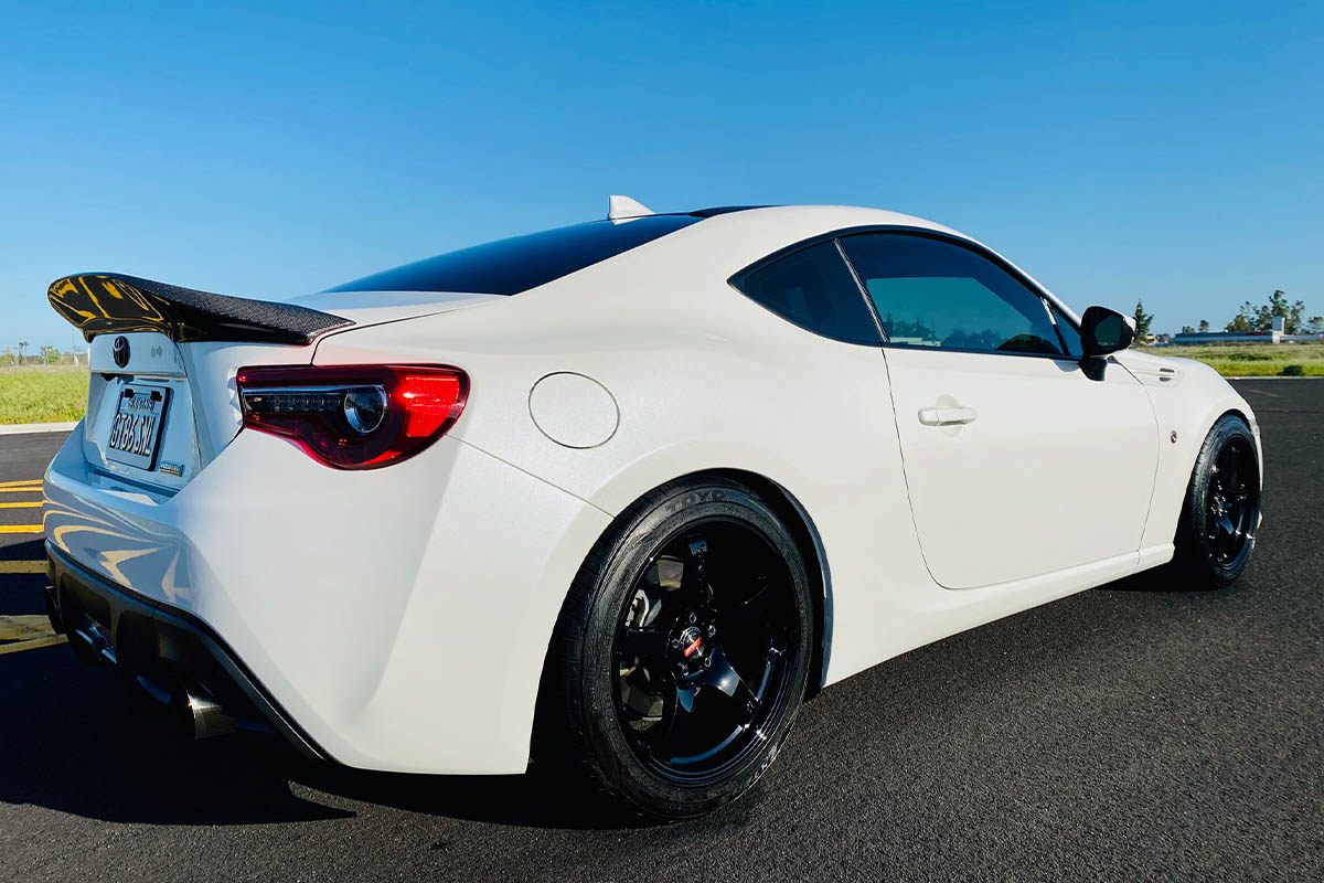 Due to the lack of style offered from the factory wheels, our customer installed a set of GramLight 57CR Wheels. With the 17×9 sizing and +38mm offset the 57CR fills the fender wells of the GT86 perfectly while offering a snug fender to wheel fitment all the way around. The wheels are a Glossy Black finish to top off the sleek performance look.