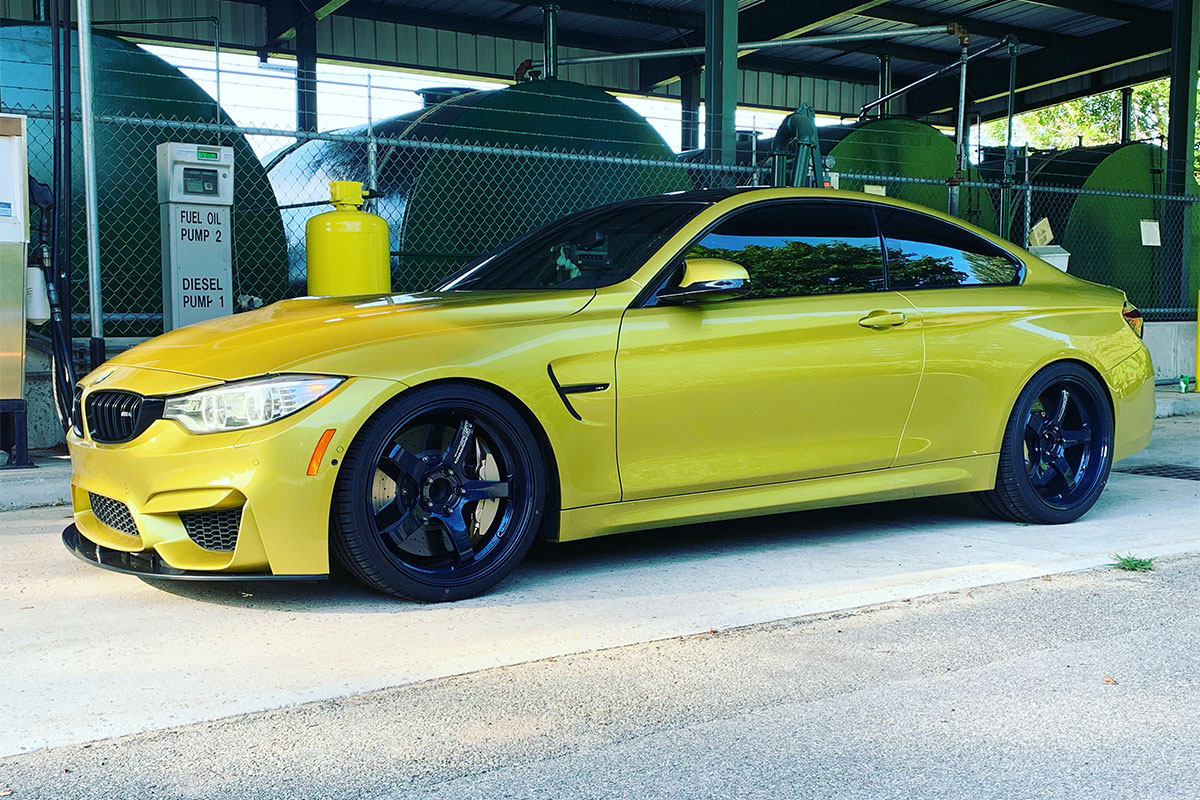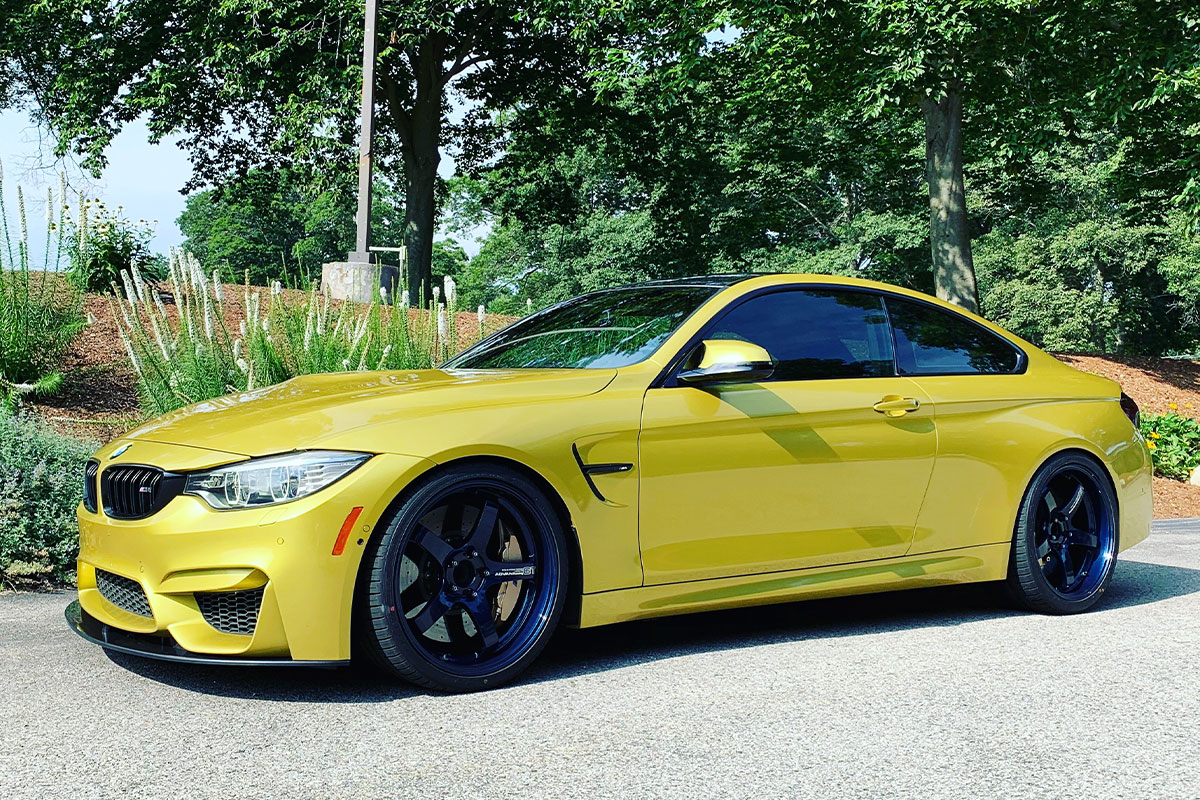 For enthusiasts who want a strong, lightweight, track-worthy wheel, Advan is a very popular option. The Advan GT, in particular, is a very simple five spoke wheel with a mold form forged construction. This type of construction is stronger than the typical forged construction and very lightweight. This particular customer chose a set of 20” Advan GT Premium wheels in Titanium Blue for their Austin Yellow F82 M4.