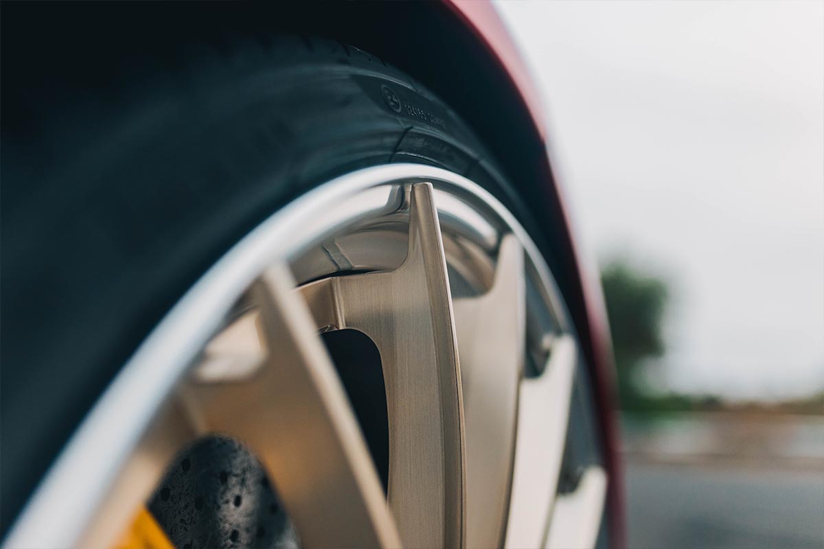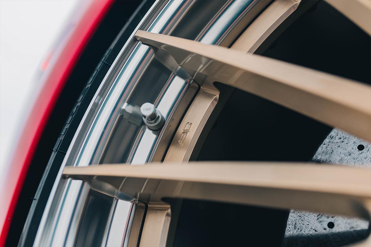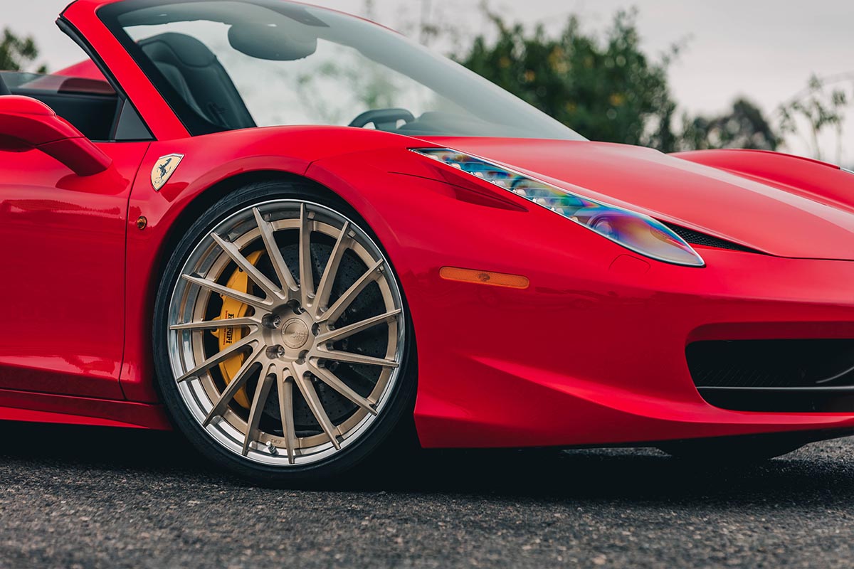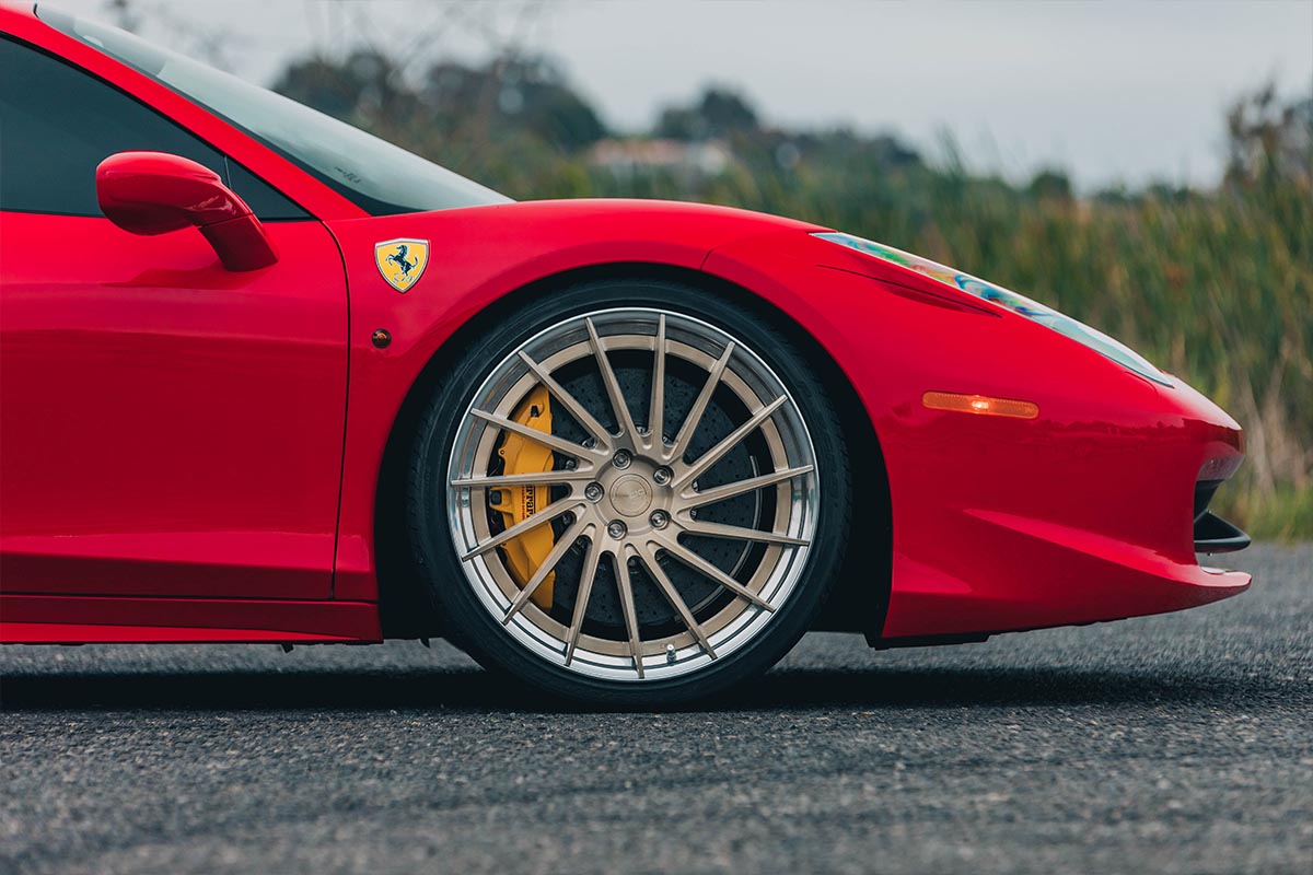 The polished step lip with an elegant directional spoke design makes the HCA215 wheels mesh well with the sporty body styling of the 458 Spider. With brushed royal gold faces, the wheels pop against the famous Rosso Corsa red. The immaculate construction and attention to detail of the HCA215 wheels are an excellent pair to the 458 Spider.