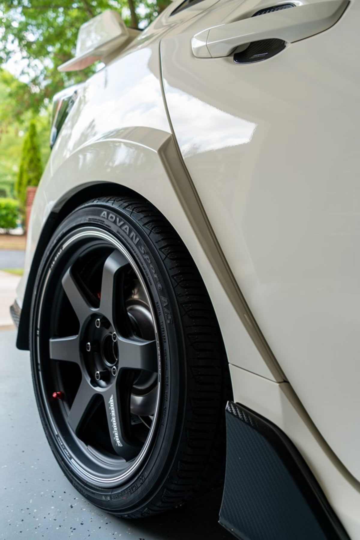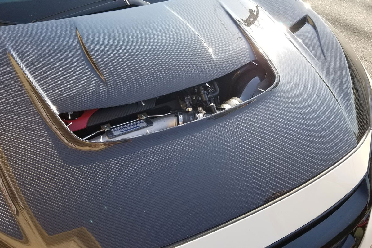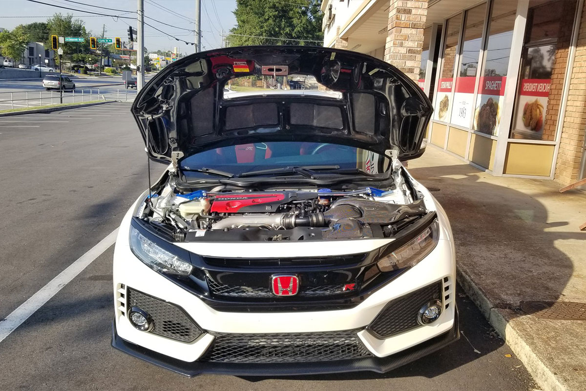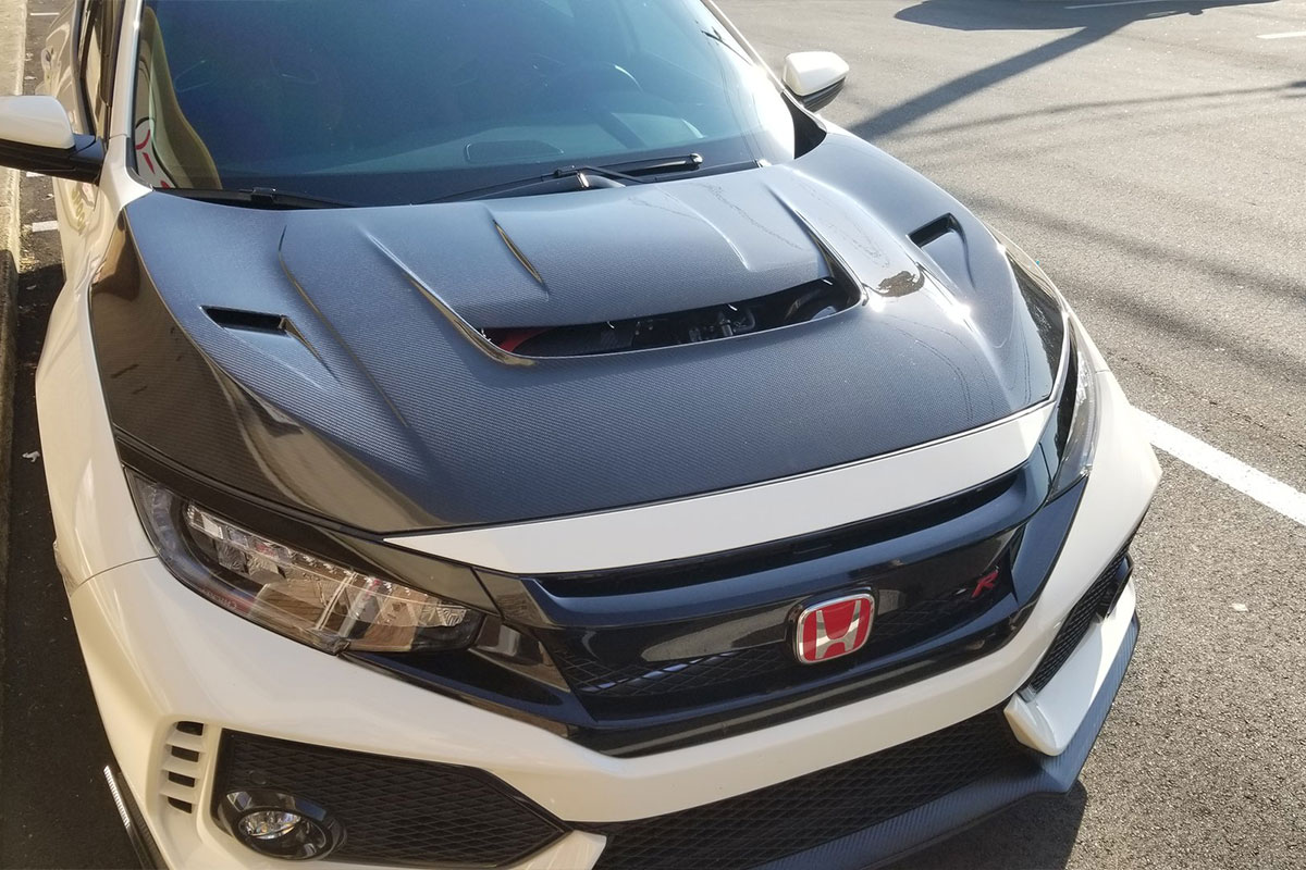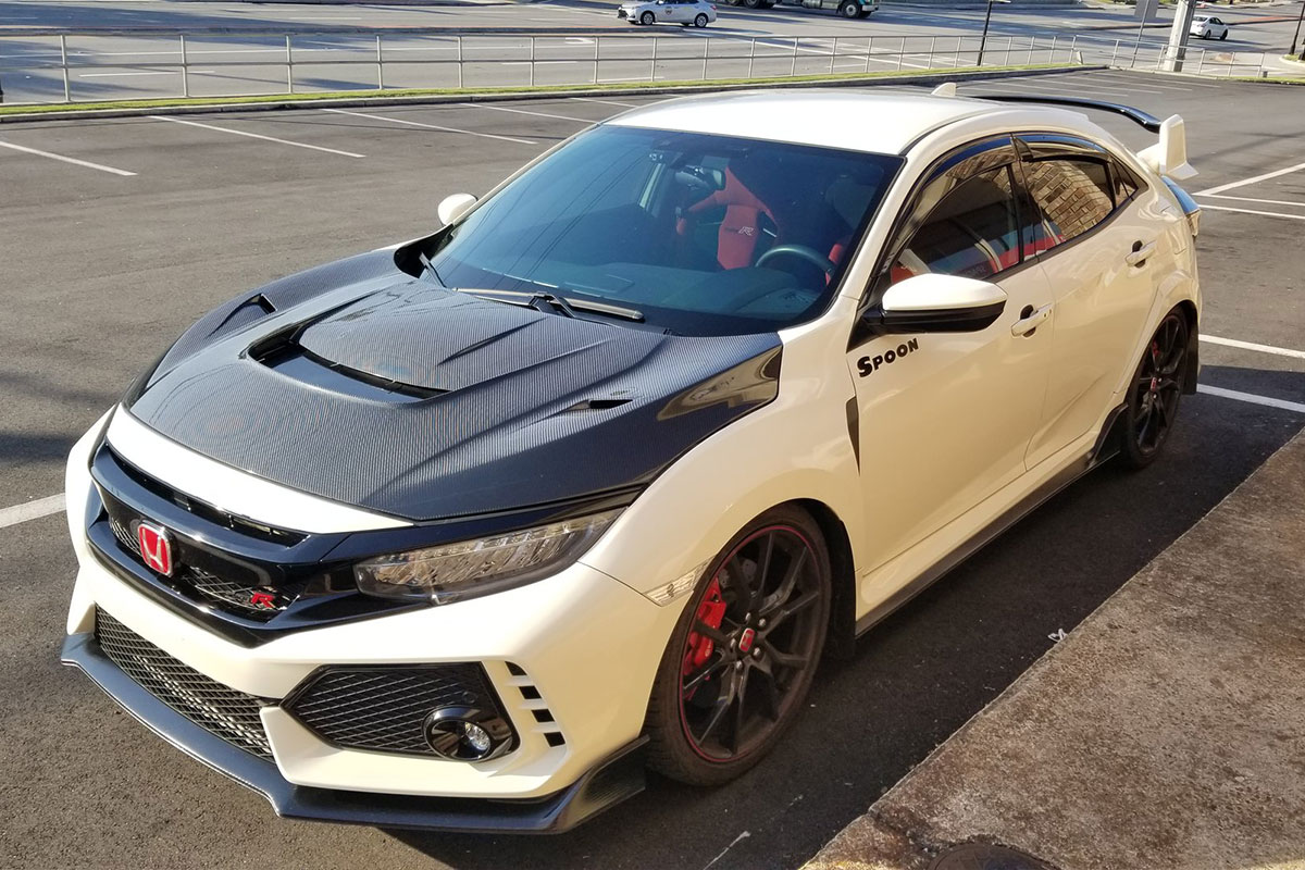 Other modifications on this FK8 include a GruppeM carbon fiber intake to increase airflow, an APEXi N1 Muffler, Cusco Front Strut Bar, Spoon Head Cover, Varis Carbon Hood, Varis Rear Fender Trim, and more.