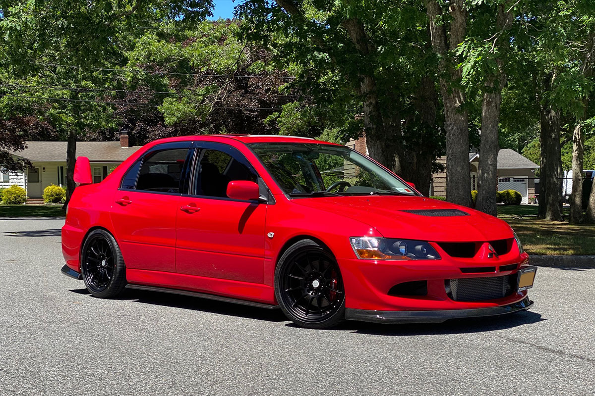 Enkei NT03 wheels offer the perfect track stance for the Mitsubishi Evo. The black finish against the bright Rally Red paint provides an intense contrast. The addition of a Voltex diffuser ties together the rear end while offering essential ground effect. Both of these vehicles have been meticulously modified to offer a thrilling experience and look good while doing it.