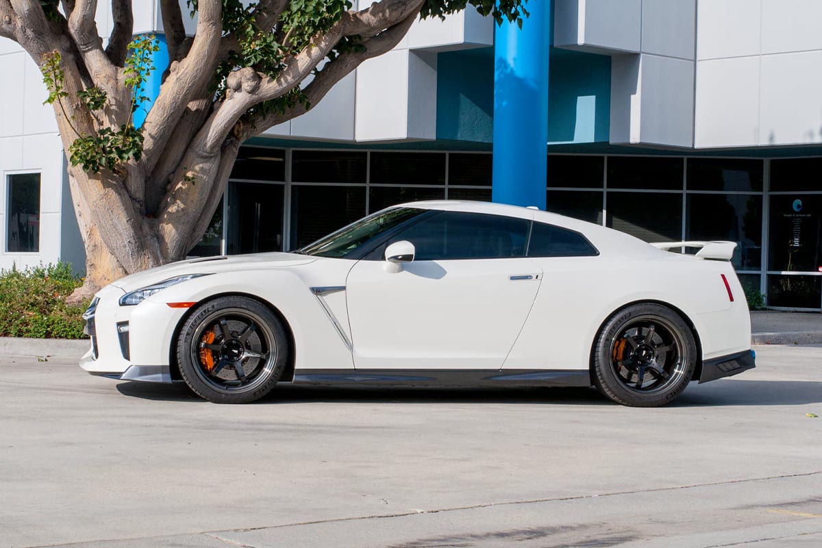 To provide a flush lip to fender offset, the front wheels are 20×10 +35mm and the rears are 20×12 +20mm. Completing the performance look of these wheels is machined lips with black coated graphite faces. The contrast between white and black on this GTR blend well and offer the ultimate sport look.