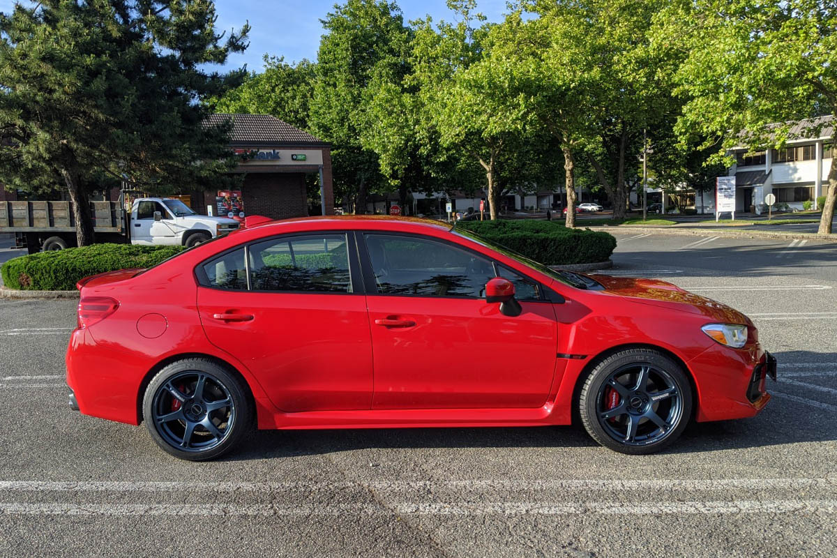 18×9.5 +38mm were placed on all four corners for traction and provide a flush stance. The Matte Blue Gunmetal finish on the TE037 mesh well with the vibrant red color of the STI. Being such a dark blue, they look black at night giving off a stealth feel. The lightweight construction of each wheel proves the level of quality and performance that was considered when producing the TE037 6061 wheels.
