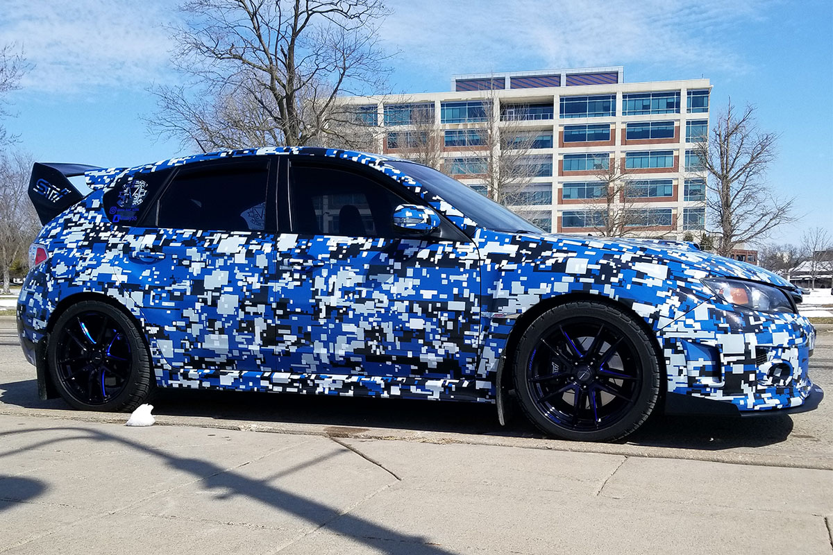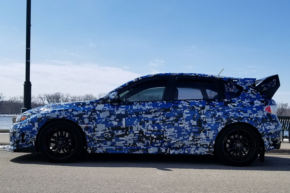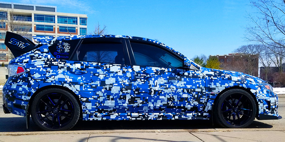 In case you didn’t know, Vivid Racing is a big name in the Subaru community. It all started back in 2002 with the first WRX build that launched us into the big leagues. Fast forward 16 years to 2018 and we are still selling Subaru parts. One of our customers recently picked up a set of WedsSport RN-55M wheels for their WRX hatchback. These wheels have a split five-spoke design, and with the beautiful blue color, they really pop on this WRX. Speaking of pop, the insane blue camo wrap on this WRX really makes it stick out from the sea of other Subarus out there.