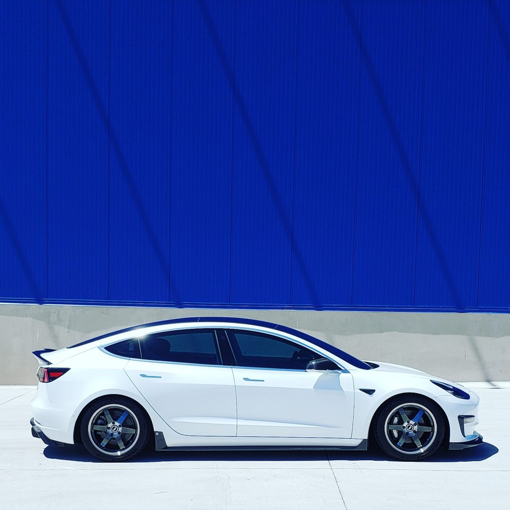 - Wheels: Volk Racing TE37SL 18×9.5 +35 custom stickers, machined for Tesla Model 3