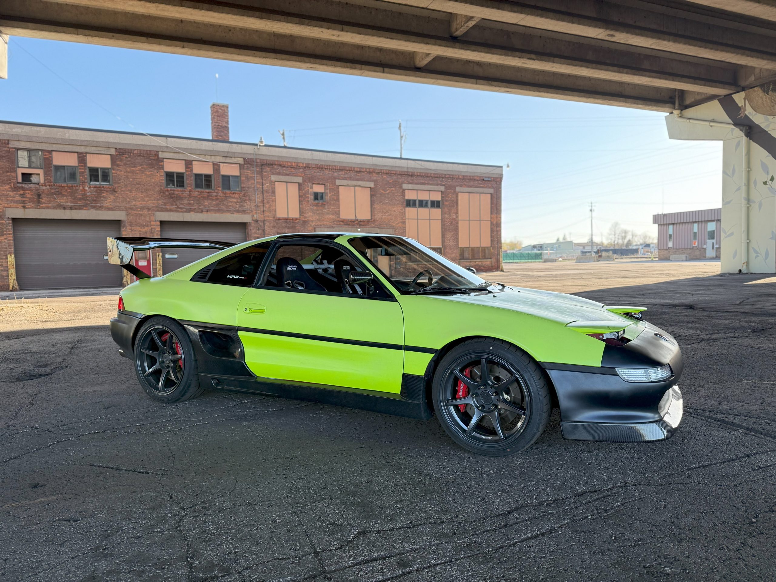 - Exterior: MR2 Heaven “Holy Lip” in Carbon Fiber; MR2 Heaven GReddy style side skirts in Carbon Fiber; MR2 Heaven V-Mount wing in Carbon Fiber; MR2 Heaven Wiper Cowl in Carbon Fiber; APR Performance GT3 Side Mirrors in Carbon Fiber; 3M 1080 Neon Yellow Vinyl Wrap; Auxbeam 6” DOT Driving Light Bar Custom Headlights (low rise); Wokeu Custom side window lights “MR2 Type-S”; Honda OEM front badge