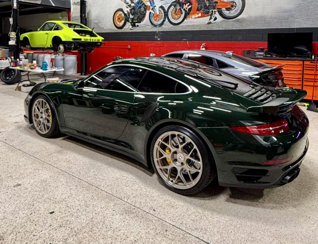 Finally got my first Porsche. A PTS Brewster Green Turbo S. I love its uniqueness but wanted to add a subtle change. So I color matched the wing extension. Love how it flows