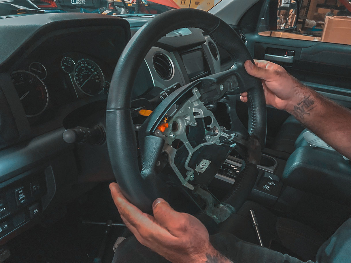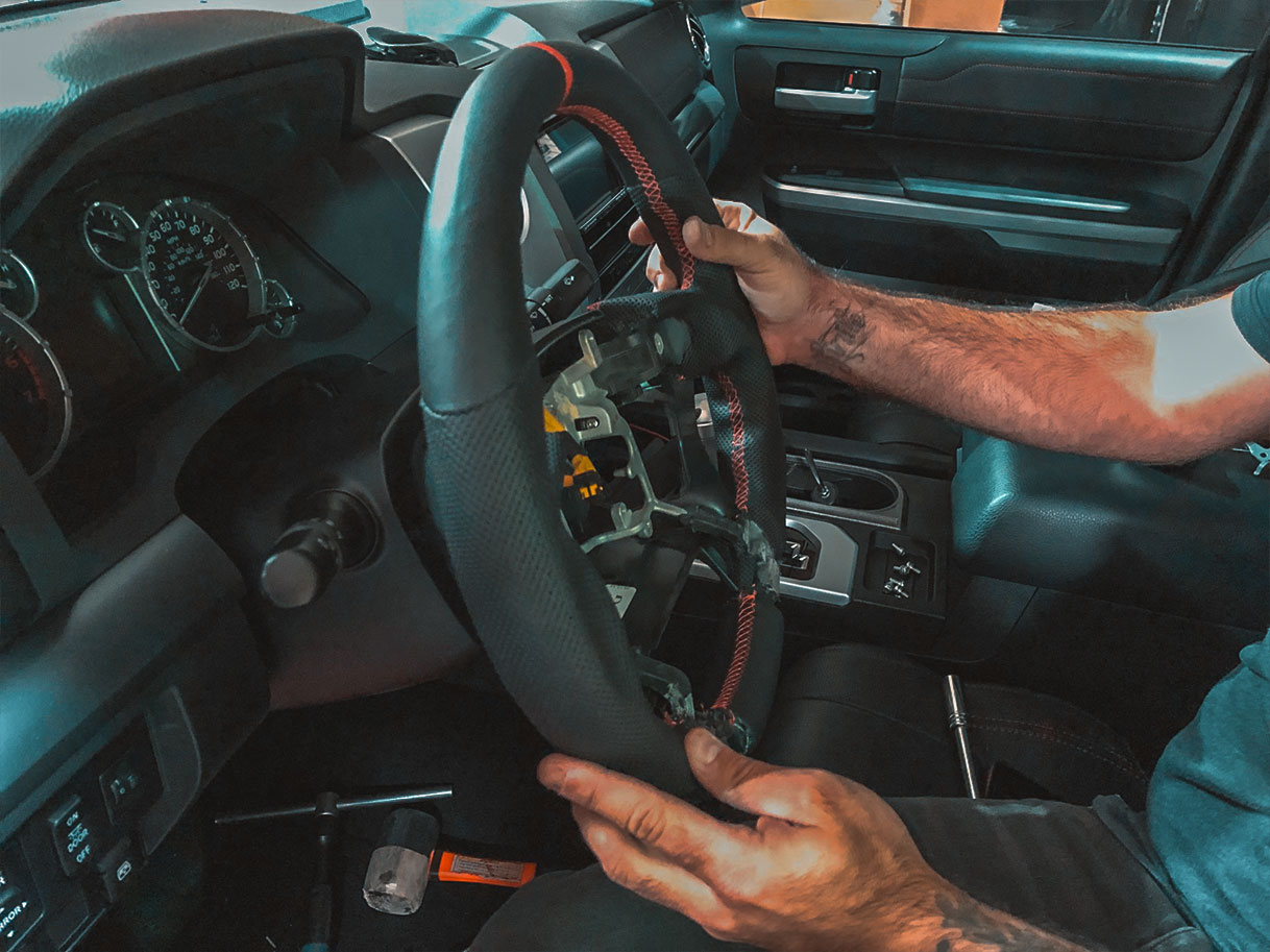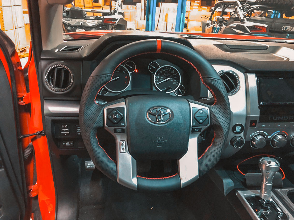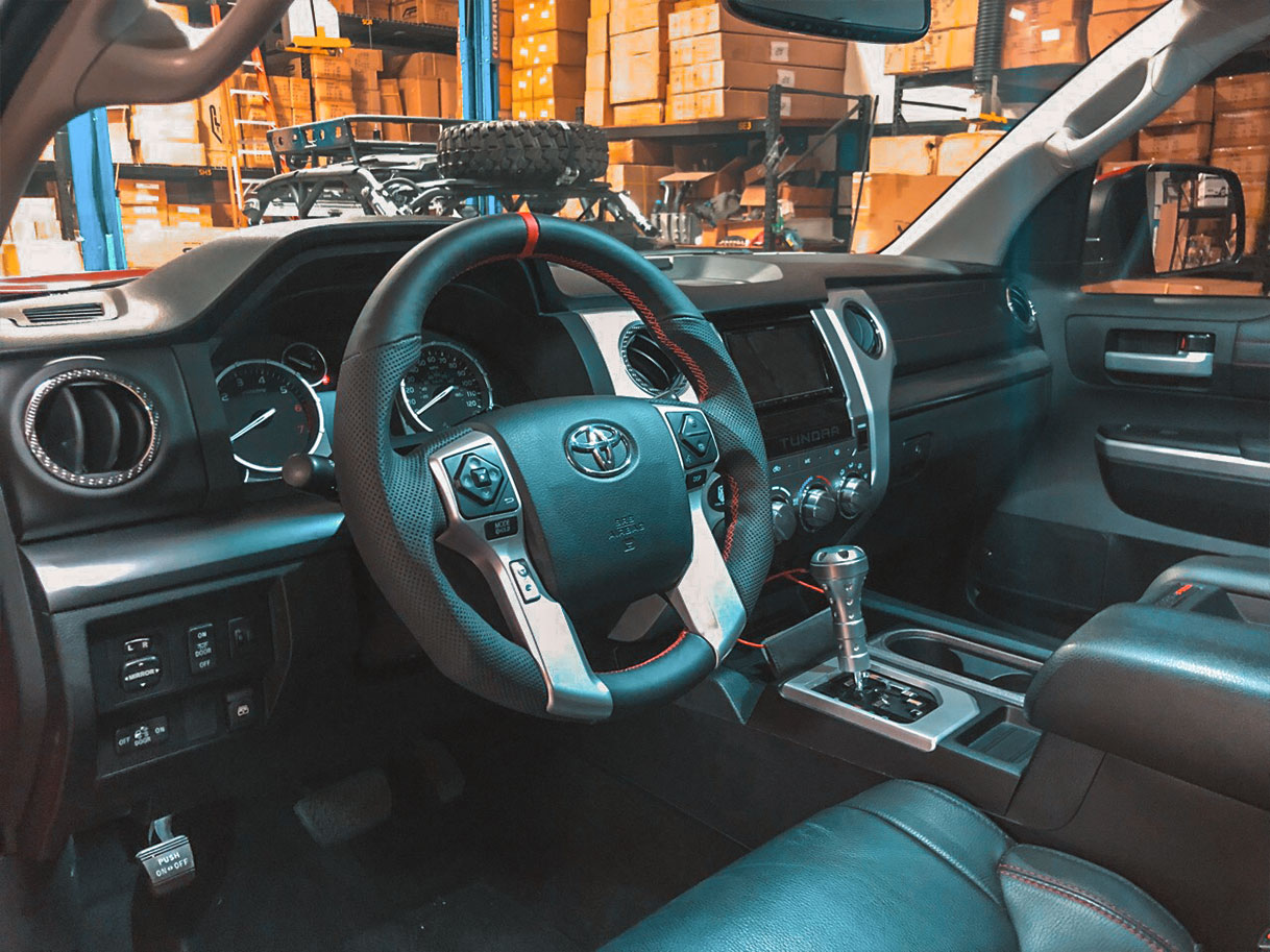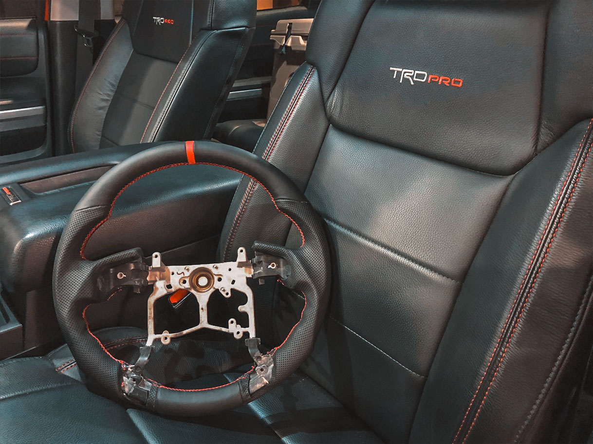 The steering wheel is the component you use the most while driving. Every single time you drive, you’re gripping and sliding your hands all over it. The thing is, most steering wheels are boring and aren’t particularly comfortable to hold. You might not need some crazy flat-bottom steering wheel in your truck, but something more comfortable than the stock steering wheel would make driving that much better. This is where we come in with our new Tundra/Tacoma/4Runner steering wheels, which is exactly what we installed in this customer’s Tundra TRD Pro.