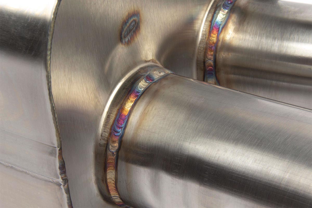An aggressive throaty tone is achieved due to the larger diameter tubing which also increases the power by 8HP and 6 lbs/ft of torque. The muffler reduces weight by five-pounds compared to the factory. Completing this elegant exhaust is the quad 4.5-inch dual-wall and laser-engraved exhaust tips available in coated black or polished finishes.