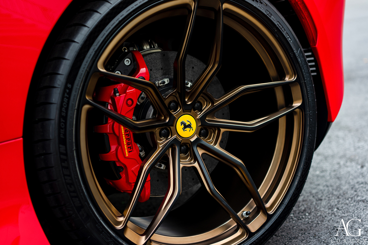 The Ferrari F8 pictured in the gallery below sits beautifully on Avant Garde Luxury AGL64 monoblock wheels. The wheels measure 21×9 inches at the front and 22×12.5 inches at the rear. They are finished in a stunning polished antique bronze color with a contrasting matte black face that delivers the ultimate three-dimensional aesthetic to complement the signature Ferrari red exterior flawlessly.