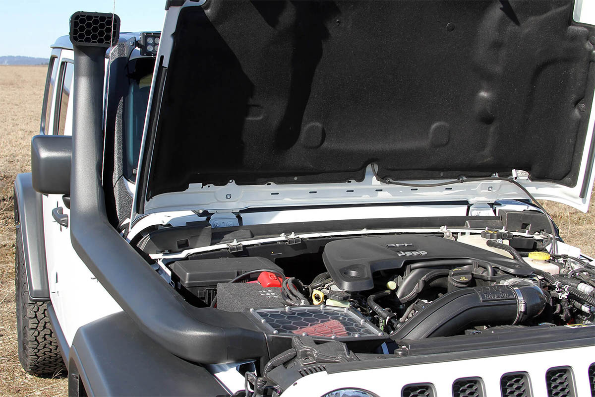 Positioning the inlet tube high up and sealing the filter box allows you to submerge the vehicle without sucking water through the intake. Although it is not ideal to fully submerge any vehicle, it is better to not be limited in where you can travel. Flowmaster developed a snorkel intake system for the Wrangler JL/JLU and Gladiator JT platform to provide a quality cold air intake and give you the freedom of adventure no matter where you go.