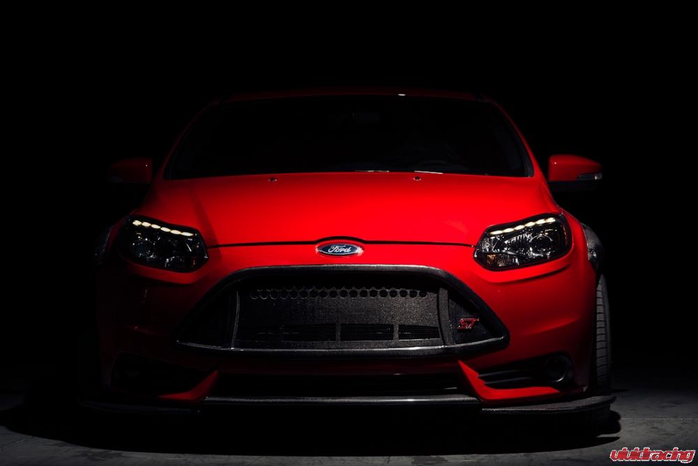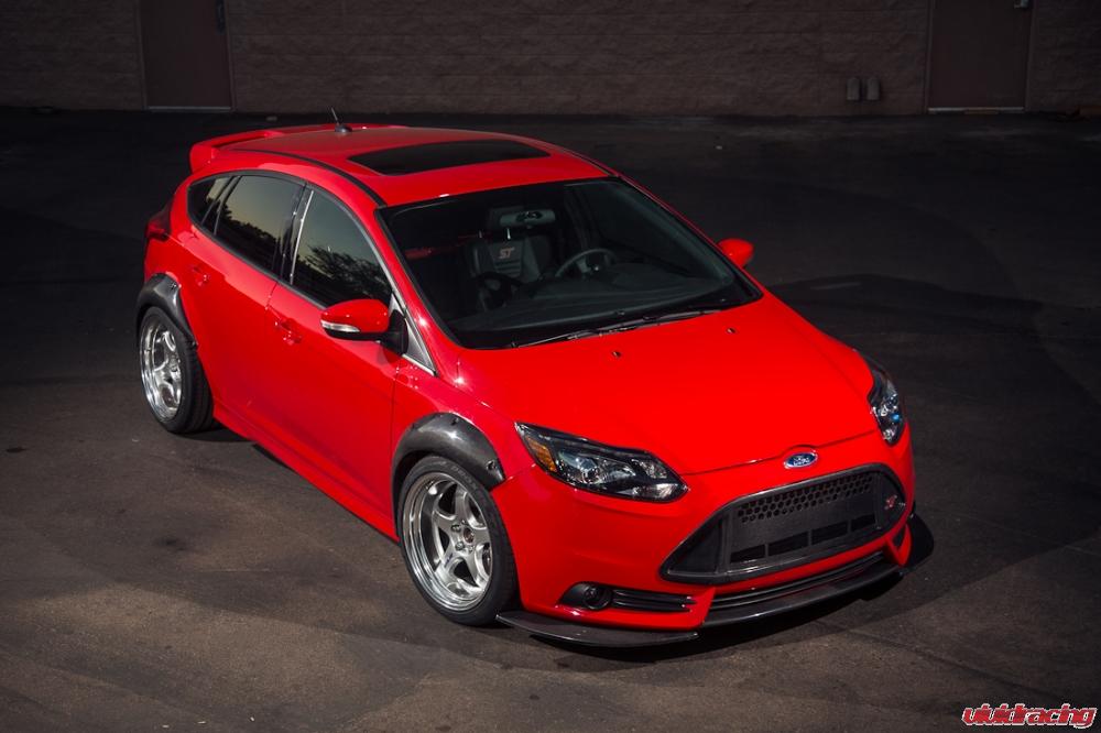 The Ford Focus ST has been under the knife since January 2013 and we definitely have a lot to show for it.  With a cumulation of performance parts including the intercooler, exhaust, intake, and more from from Agency Power, we have also had the opportunity to build this entire aero kit enhancement out of carbon fiber.  The Focus ST in its normal off the shelf look is not a bad looking car.  But it just seems to skinny for such a hot hatch.  With a majority of us relating to the rally cars of WRC, this Focus really needed more of a squat than a stance.  With our own in-house composite department (aka the meth lab), we created these parts taking queues from many different rally car photos of the past couple decades.  The hard line fenders are designed to accompany a 10.5 inch wide wheel like these Work Wheels Meister with Toyo Tires we have on.  The bottoms of the fenders have a hard straight edge similar to the Ford Fiesta R2 rally car (seen here).  The monster carbon fiber grill serves both a function and form.  It definitely helps give more airflow to the larger intercooler while hiding the factory bumper beam.  Giving it a larger mouth was influenced from Brian Deegan’s Ford Fiesta rally car (seen here).  The front center lip was a simple add-on to help curve out the front bumper.  But the side carbon fiber wind splitters really help bring out the width of the cars new stance.  Finally the rear diffuser is a kick to the Focus RS of Europe (seen here).  Instead of building a complete rear apron, we wanted to build a add-on part which also gave the empty rear end some more aerodynamics.