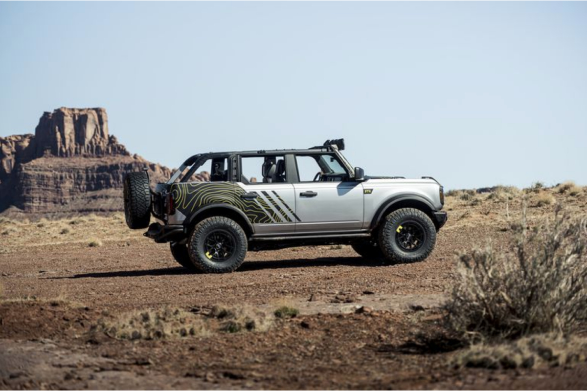 The first Bronco is based on the four-door Badlands trim and can be easily identified by the silver and neon green exterior adorned with topography-themed livery. All customizations on this Bronco were done by RTR Vehicles, a long-time tuner and Ford accessories partner. RTR was founded by pro drifter and Formula D racer Vaughn Gittin Jr.