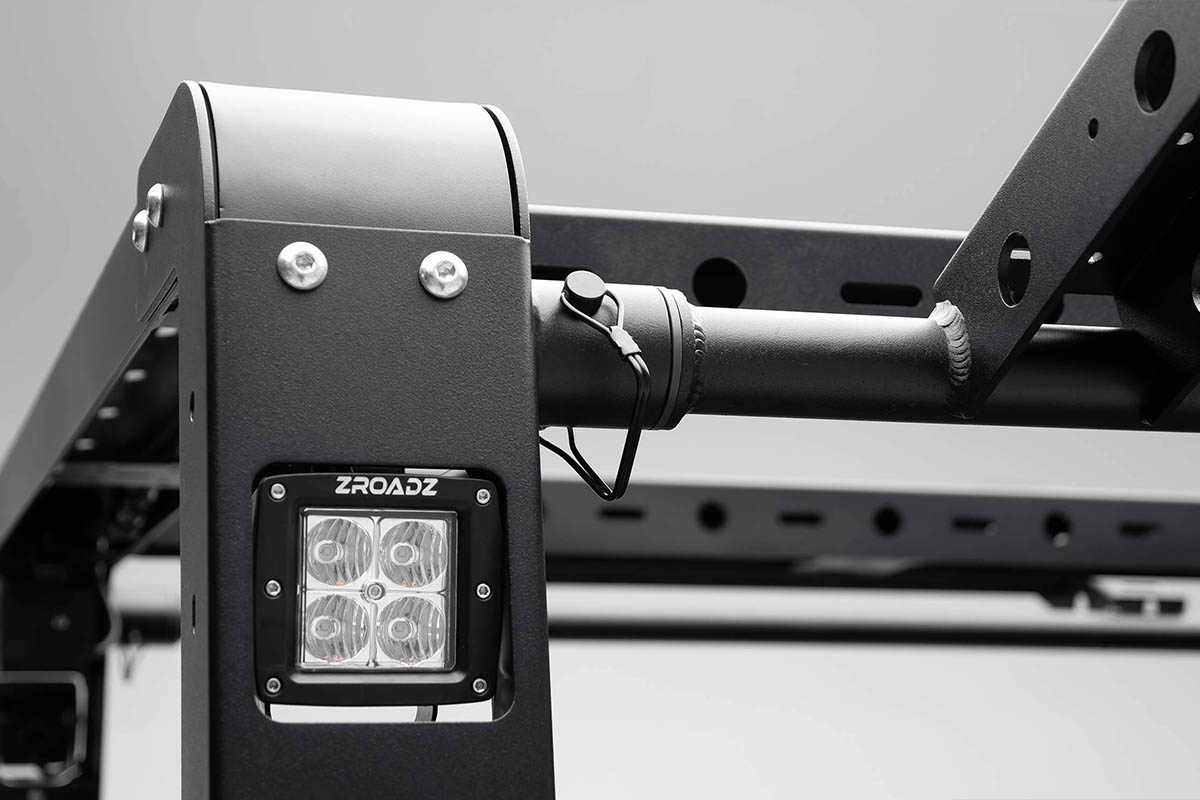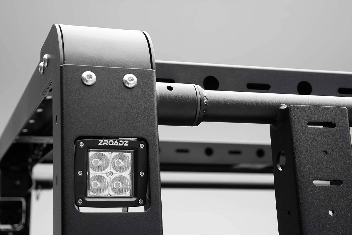 Included with the overland rack are 2-inch pod lights on all four corners to give you a clear view of your surroundings directly behind you, or provide extra light on your camping site. Mounting plates are also placed throughout the framework to attach additional accessories below 30 lbs. load. With a texture black powder coat finish, the ZROADZ overland rack will be the perfect addition for your endeavors.