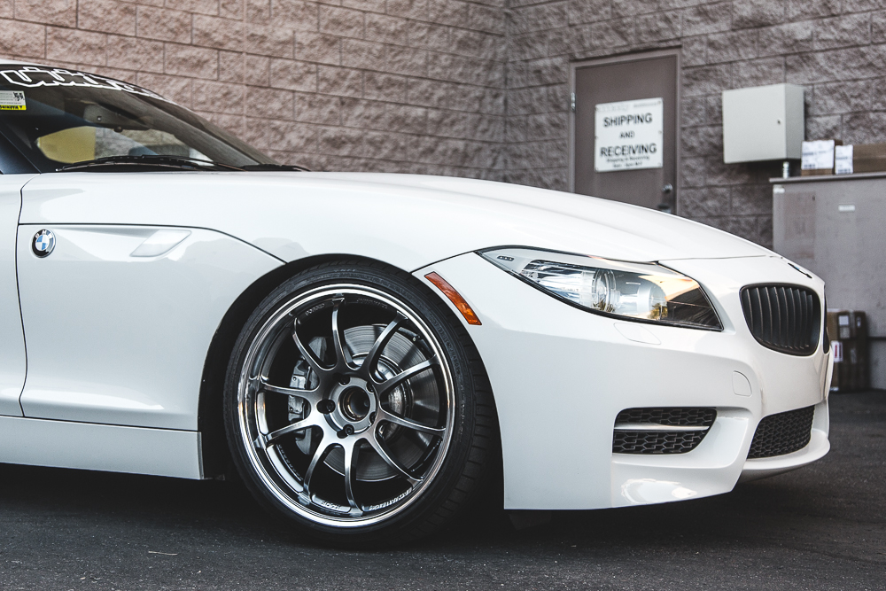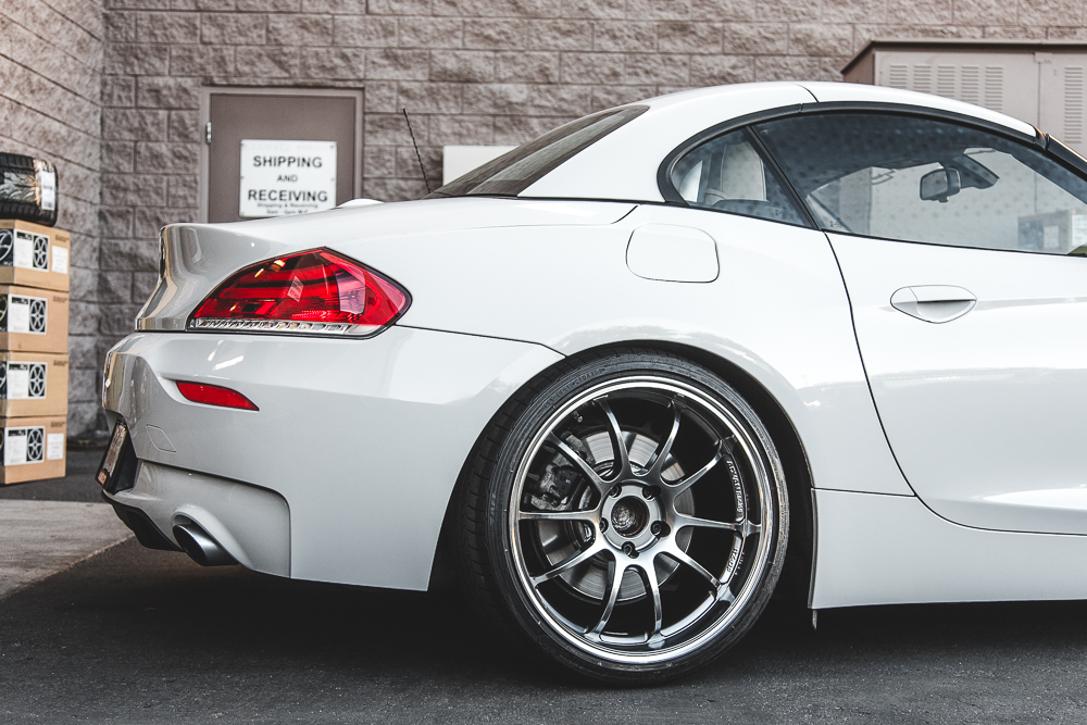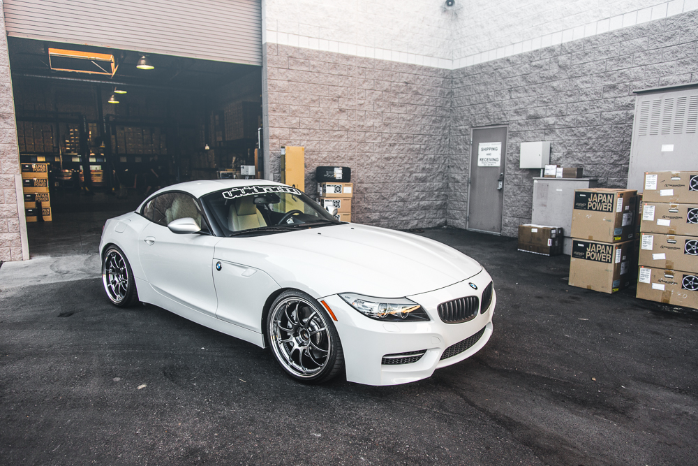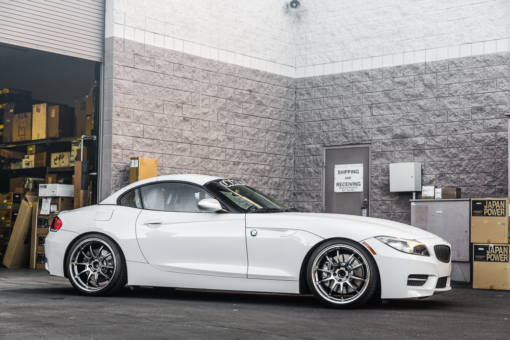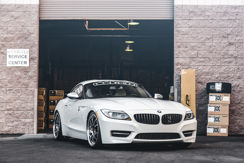This is probably one of the sleepers of the 35I turbo motor series from BMW. The Z4 features the N54 twin turbo engine pushing 300 horsepower stock. Add in a VR Tuned ECU flash and exhaust and this beast comes alive. But with enough power already, the owner wanted to style it out and make the handling more rigid than the stock cush from BMW. Adding a set of H&R lowering springs that drop the cars front and rear 1.2 inches, he also added a set of H&R sway bars to keep the rear wheel drive car in balance. The front is a non adjustable 27mm sway bar and the rear is a 21mm adjustable. The reason the front sway bar is so much thicker is the RWD cars tend to have more oversteer and a beefier front sway will help neutralize this. Along with suspension, a set of Advan RZ-DF wheels were added in 19 inch that have the perfect offset for this sport coupe. Touch it off with a Vivid Racing sticker and we have greatness! Check out the pics and make sure to shop for all your BMW Z4 parts here.