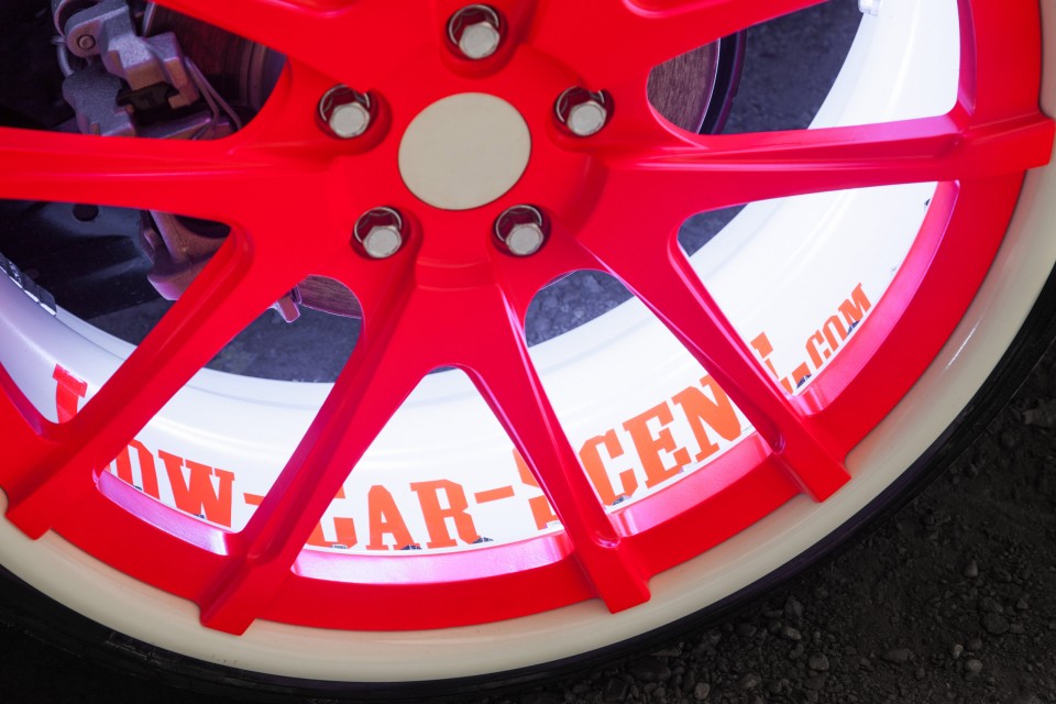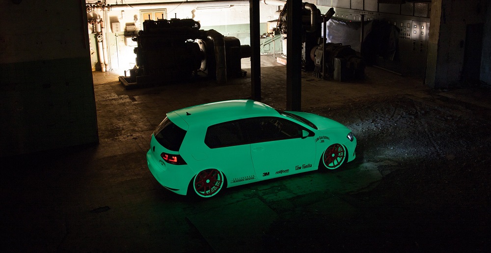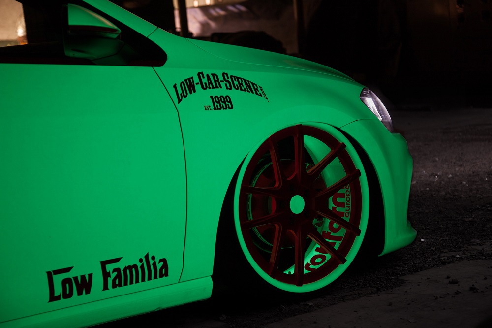 At first glance the car just looks like it’s wrapped in a off white almost mint color. The neon pinkish, orange Rotiform wheels and accents really stand out. The LED’s in the front draw attention too but, all-in-all, there’s nothing specifically impressive about this tuner… Until… The lights go out! That’s when you really see the ingenious behind this custom wrap. IT GLOWS IN THE DARK! The vehicle has been wrapped in a 3M phosphor vinyl that appears white, but then glows, like something out of Tron movie, when you turn out the lights. Not only was the exterior wrapped in the special vinyl, but so were the three piece 20″ x 8″ Rotiform wheels. Not to be outdone on any front, they added the LED’s inside the mud guards, which make the insides of the wheels glow as well.