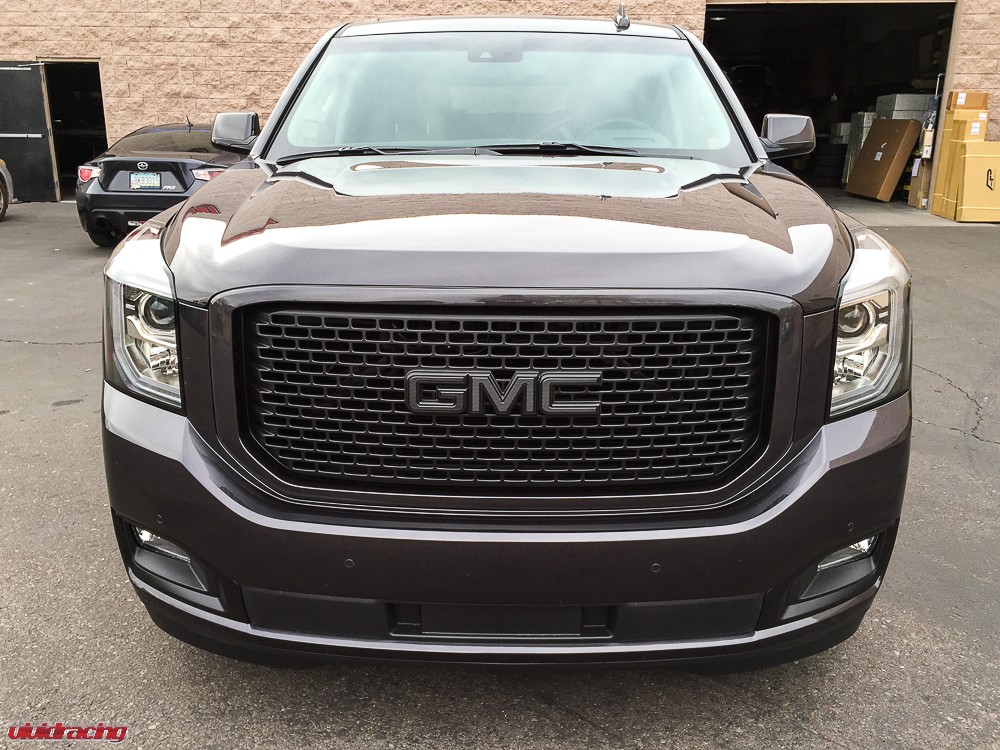 If you follow our blog then you probably recognize this GMC Denali from when we put the 24″ Dub Skrills S123 Wheels on it (Seen Here). The wheels complimented the Denali nicely but it was still lacking something…We needed to get rid of the hideous wheel gap that was separating the wheels from flowing with the design of the vehicle. We decided to fix that by installing the McGaughys Suspension Economy 2|3 drop kit. The kit lowers the front by utilizing 2″ drop spacers that retain the factory springs and in the rear the coil springs are replaced them with 3″ McGaughys drop coils with shock extenders. After the kit was installed we handed the vehicle over to Ryan from “Relentless Auto Works” to give it the finishing touch. When the vehicle returned all the chrome molding and emblems were painted black giving it a much more sleek appearance.