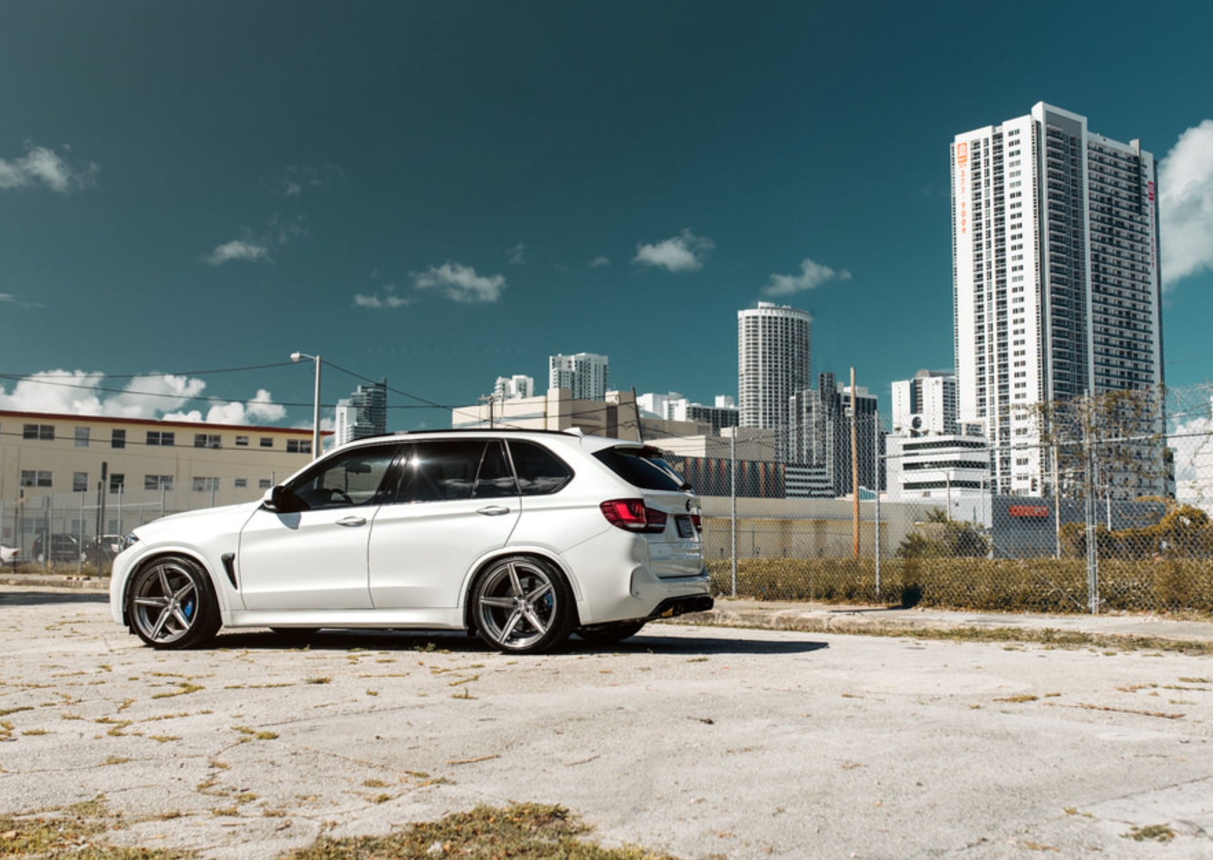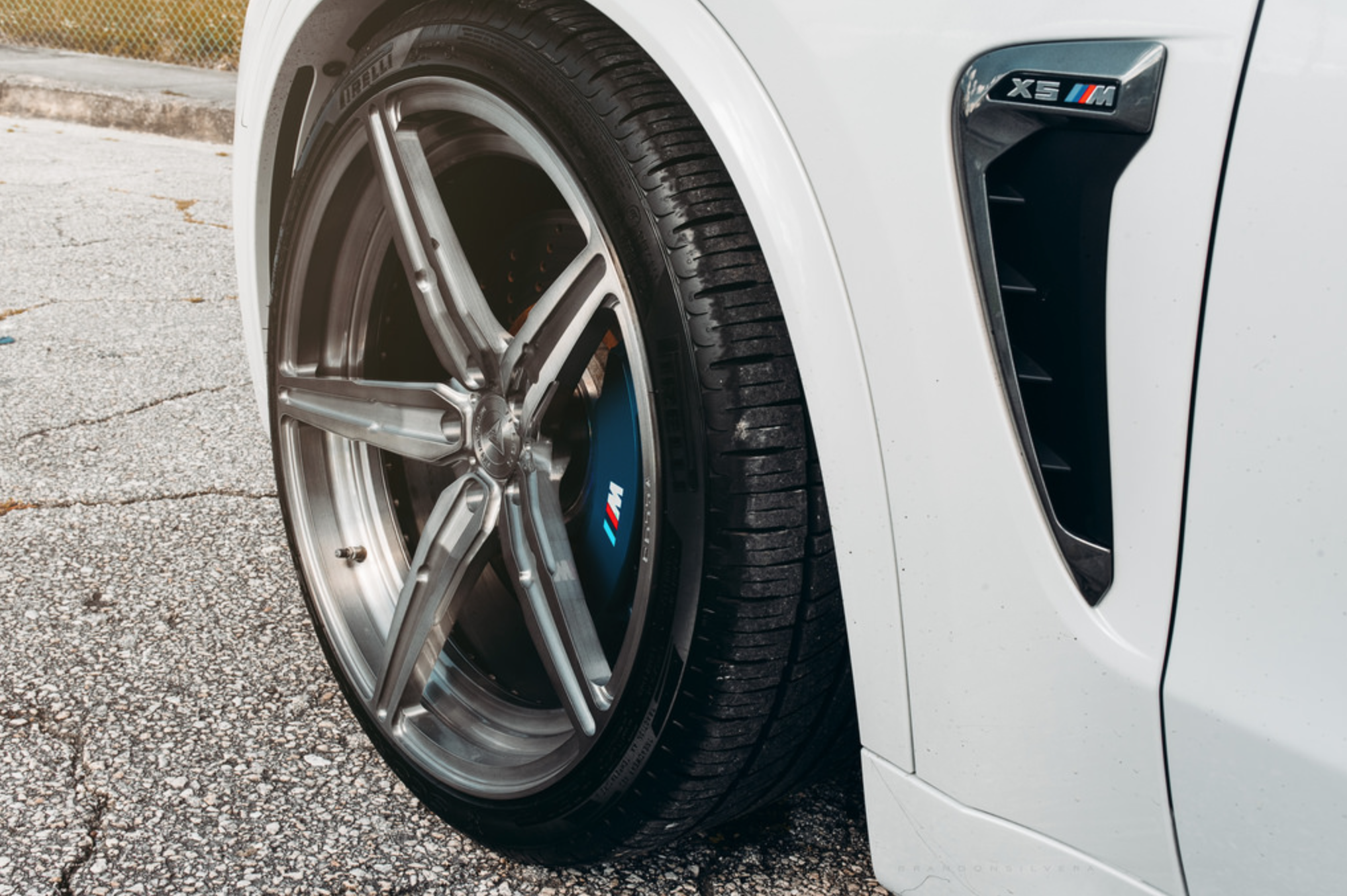 The BMW F85 X5M in the photos below features the Velos 20-inch S5 wheels (22×12 and 22×10.5) with a 2-piece configuration in a brushed finish with double dark tint and clear gloss.