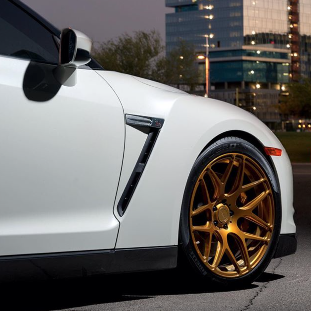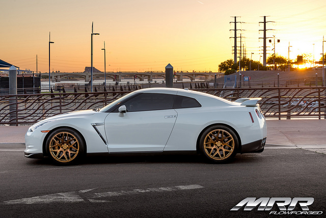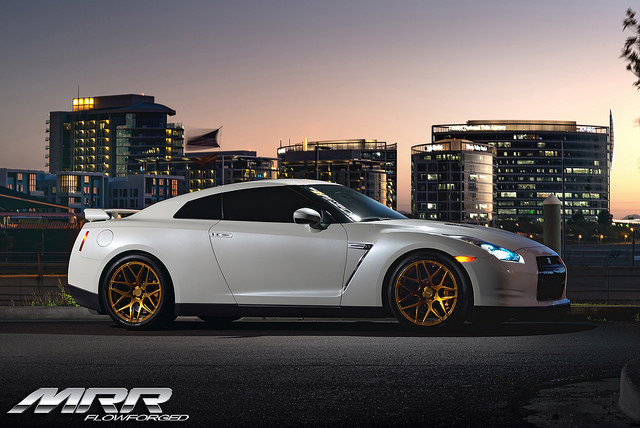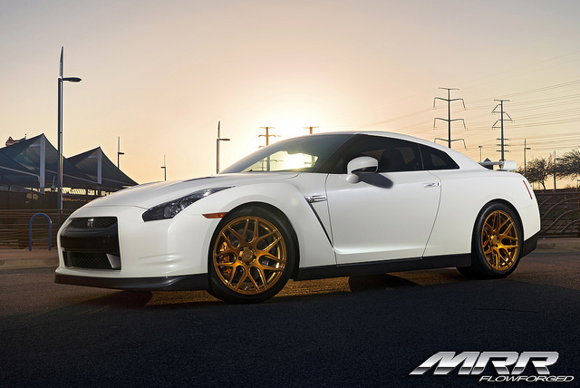 Below is a photoshoot of the MRR FS01 wheels on a GT-R. The customer installed 20×10 in the front and 20×12 in the rear. The fitment is perfect, and so is the bright gold powder coat finish!