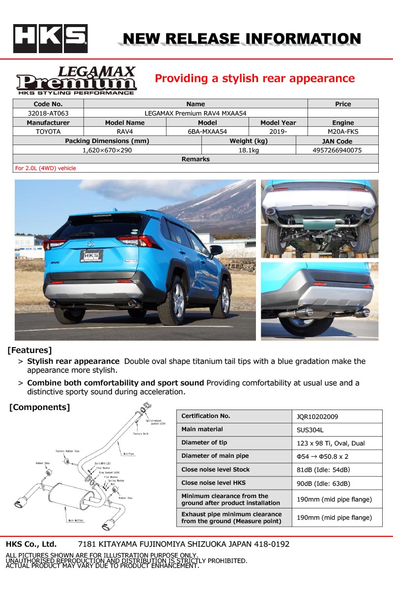 HKS is one of the first to release an aftermarket exhaust system for the 2020 RAV4. Constructed of mandrel-bent stainless steel tubing, the 2.5L engine comes to life upon the installation of the HKS Legamax exhaust system. Providing comfort and performance, this exhaust can increase the sound level 10 decibels over the factory system.