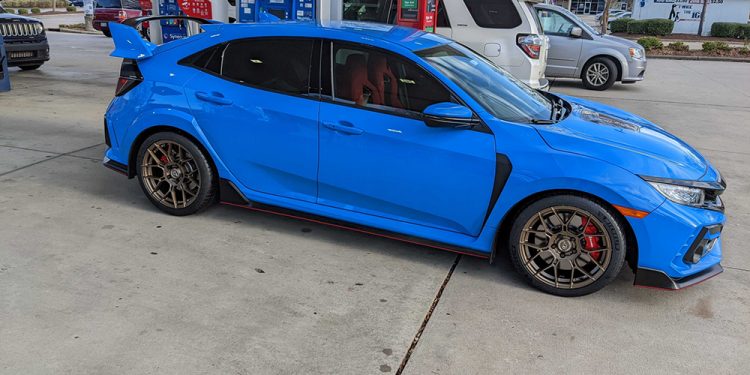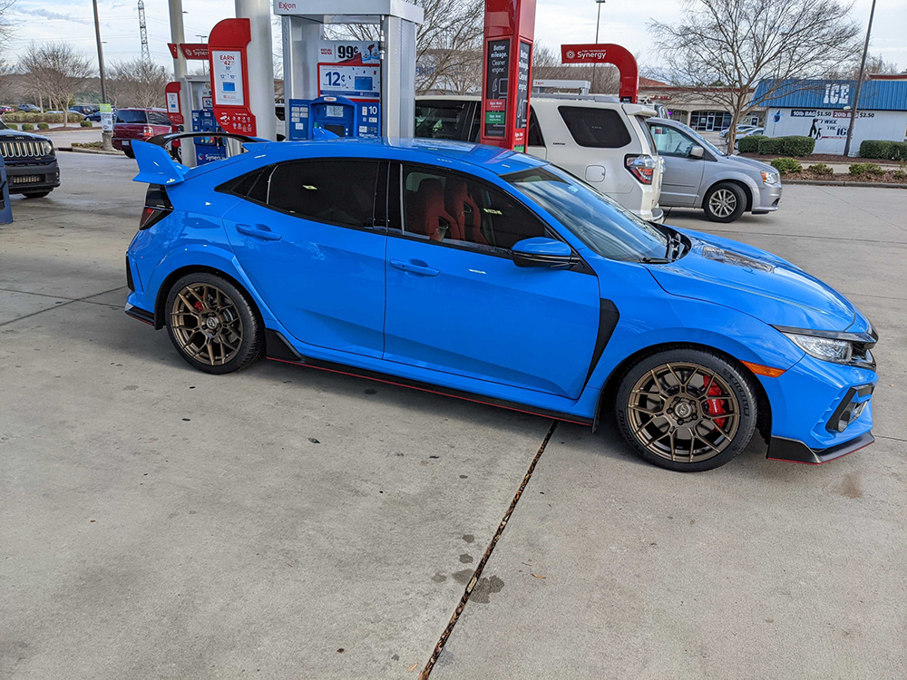 This customer’s Type R was fitted to 18×9.5 D09s all around with a +45 offset, 64.1 center bore, and a 5×120 bolt pattern. Each wheel weighs just 10 kilograms (22 pounds) and has a load rating of up to 690 kilograms (1521 pounds). Recommended tire fitment for this setup is 255/35/18. The D09s are available in Gloss White, Hyper Black, Matte Black, and Satin Bronze. The owner of this stunning blue Type R opted for the Satin Bronze finish to really give his hatchback that accented look and Rally-inspired appeal.