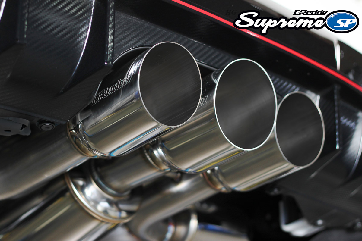 The large 76mm (3”) diameter piping flows smoothly through a large mid-pipe resonator and then branches out to the high-flow 3” center SP muffler and the two side-mounted sound chambers, before exiting the GReddy triple exhaust tips. Like all GReddy Supreme SP systems, the fully hand-welded 304 Stainless-Steel exhausts carry a Limited Lifetime Warranty.