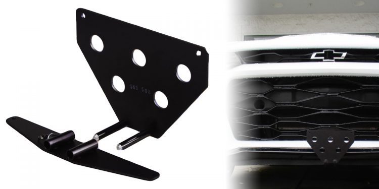 Most front plate mounting systems require the front bumper to have holes drilled into it so that a bracket can be mounted directly on the bumper. No one wants to put holes in the perfectly good bumper, so Sto N Sho developed a way for the bracket to be mounted on the bottom of the bumper. This works by using a two-piece bracket. One piece mounts to the bottom of the bumper where it can’t be seen, and another piece mounts to the plate. These two pieces slide together and lock into place using a pin, which means you can quickly and easily remove it by simply pulling the pin and sliding the bracket off.
