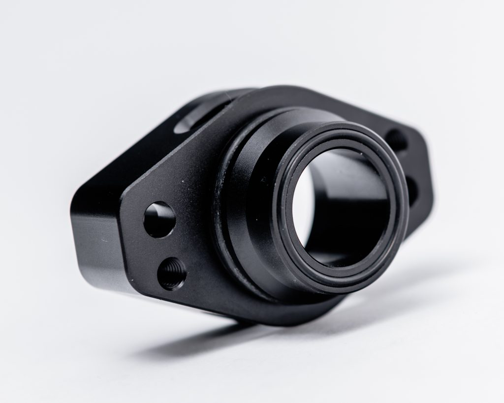 9. Line up the blow off valve with 2 open holes and insert the valve into the housing. Insert and tighten the provided M6 socket head screws.
