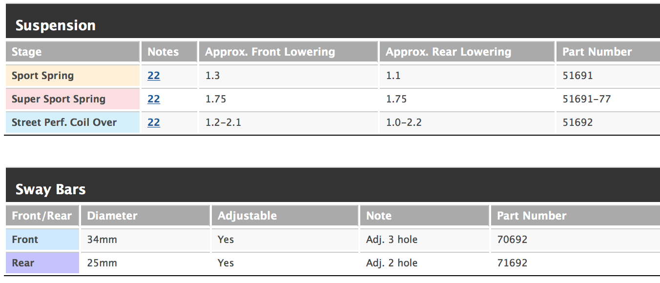 The below are tables detailing the extended suspension applications for the 2015-2016 Ford Mustang GT Fastback. These include sport springs, coilovers, sway bard and wheel spacers. The below items will fit on all 2015-2016 Ford Mustang GT Fastback vehicles including the V6, V8, and 2.3L EcoBoost models.