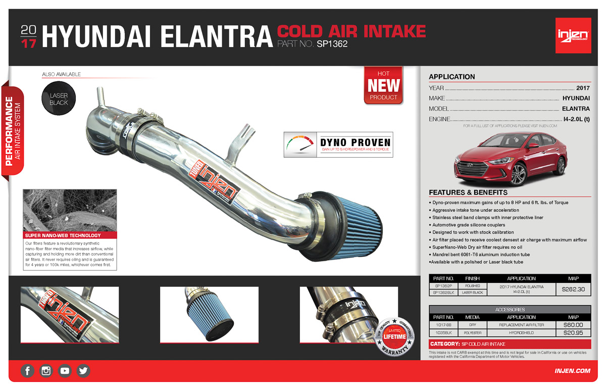 As tested by Injen, this cold air intake is proven to add 8 horsepower and 6 ft-lbs of torque. Of course, with additional modifications, this power gain can be even greater. This bump in power will make your Elantra much more fun for street driving, and it will also improve throttle response. On top of the power gain, the additional induction noise will sound great once you squeeze the gas pedal. This new intake will be available in a polished finish as well as a Laser Black finish. To top it all off, this new intake is backed by Injen’s limited lifetime warranty.