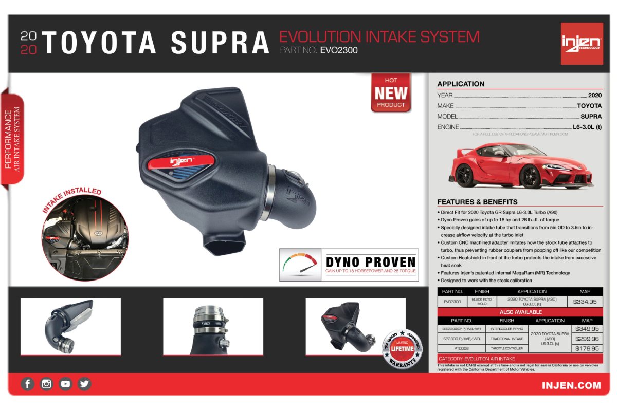 Injen’s Evolution sealed air intake system is one of the top choices among those who wish to upgrade their vehicle’s stock restrictive intake. It was expertly designed using state-of-the-art tools and processes to create an unparalleled aftermarket intake system that boasts proven power gains. Now, Injen is proud to announce the availability of its new Evolution Air Intake System for the long-awaited 2020 Toyota Supra.