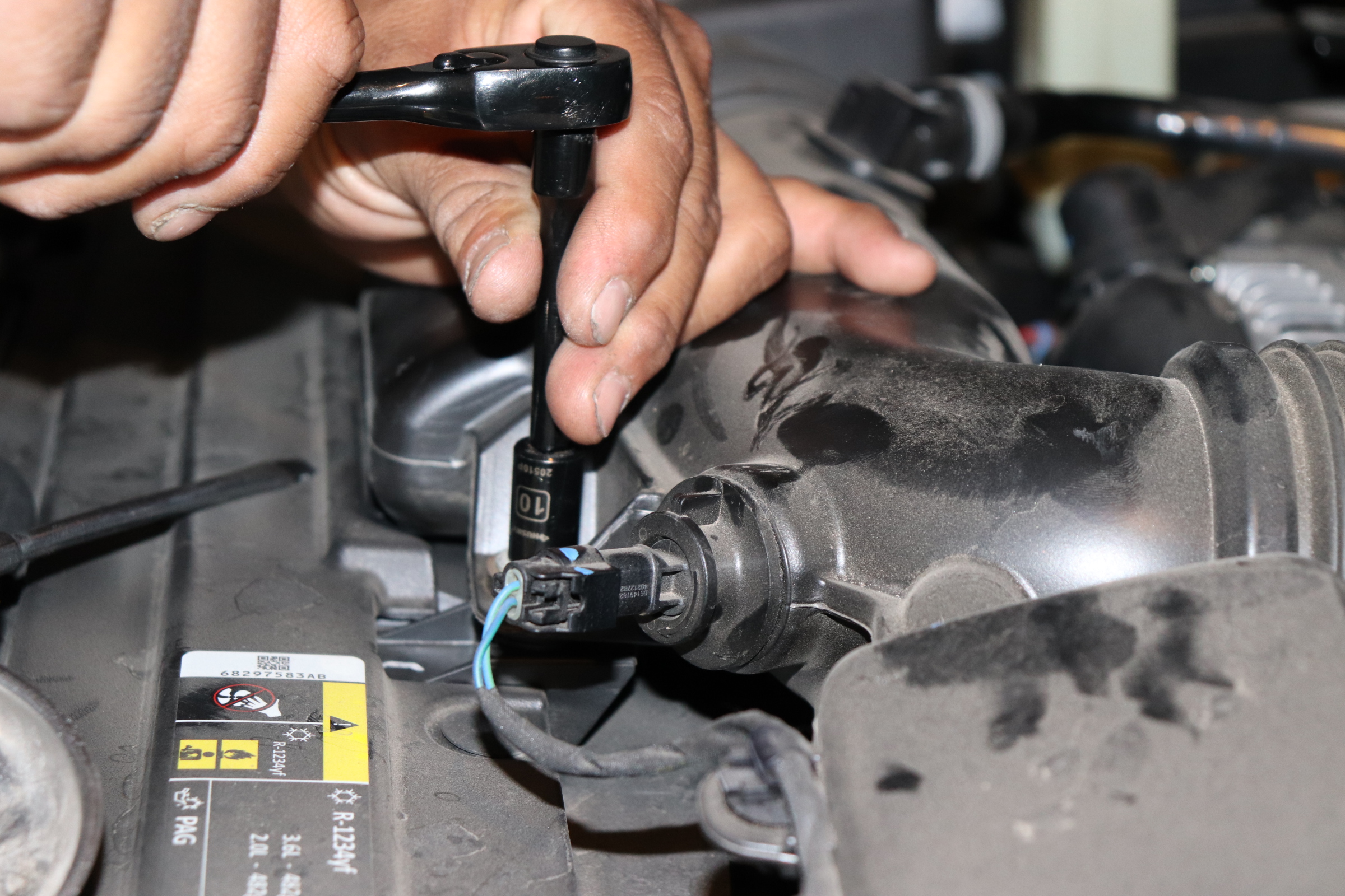 Remove the Intake Air Temperature sensor by twisting it counterclockwise and pulling it out.