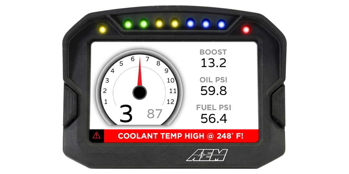One of the cool features of the CD-5 dash is the ability to set up custom warnings and alarms. If you’re trying to focus on driving as fast as possible, you might not notice that something is overheating, for example. By setting up a custom alarm, you dash will alert you when something is critically wrong. If multiple things go wrong at once, the CD-5 dash will scroll through them in order of importance.
