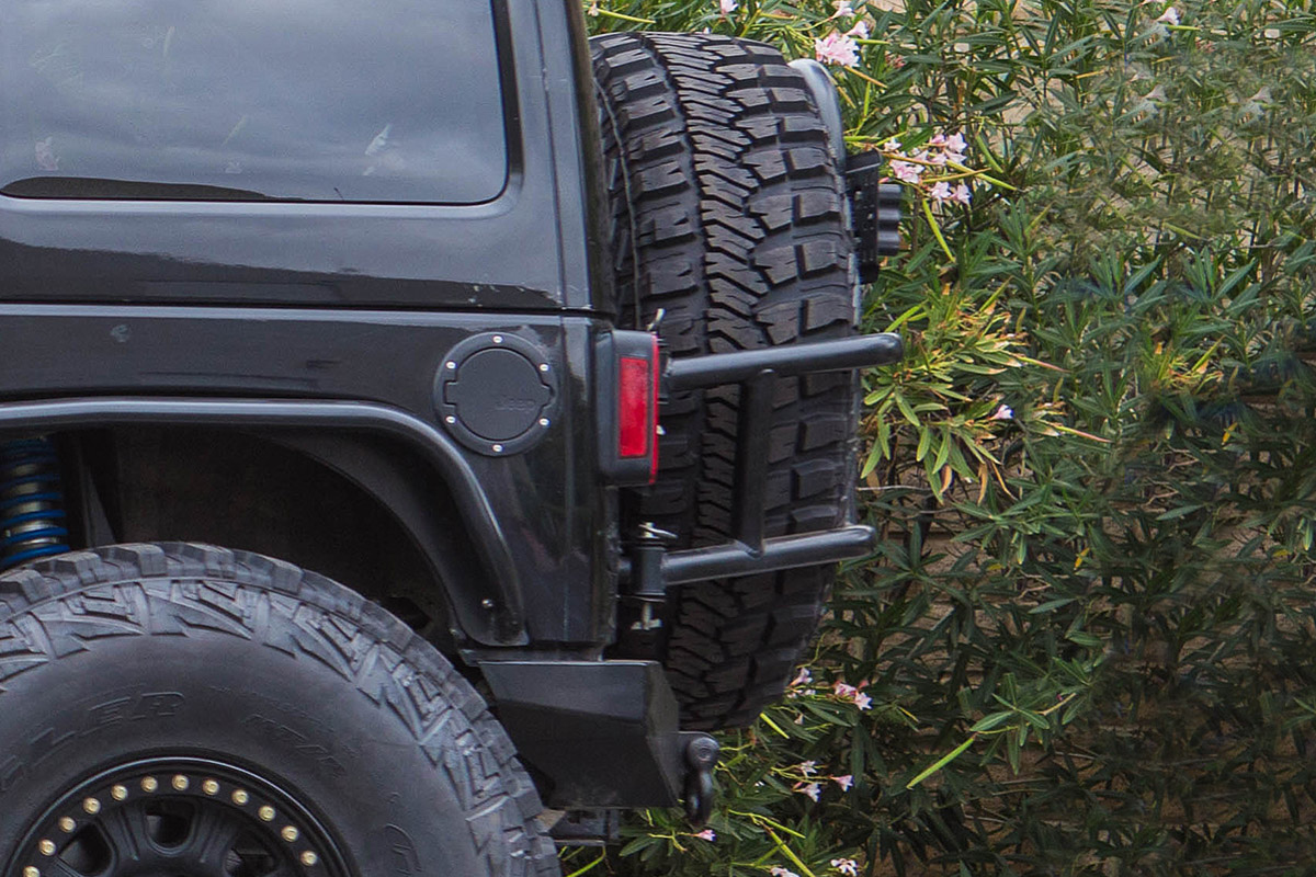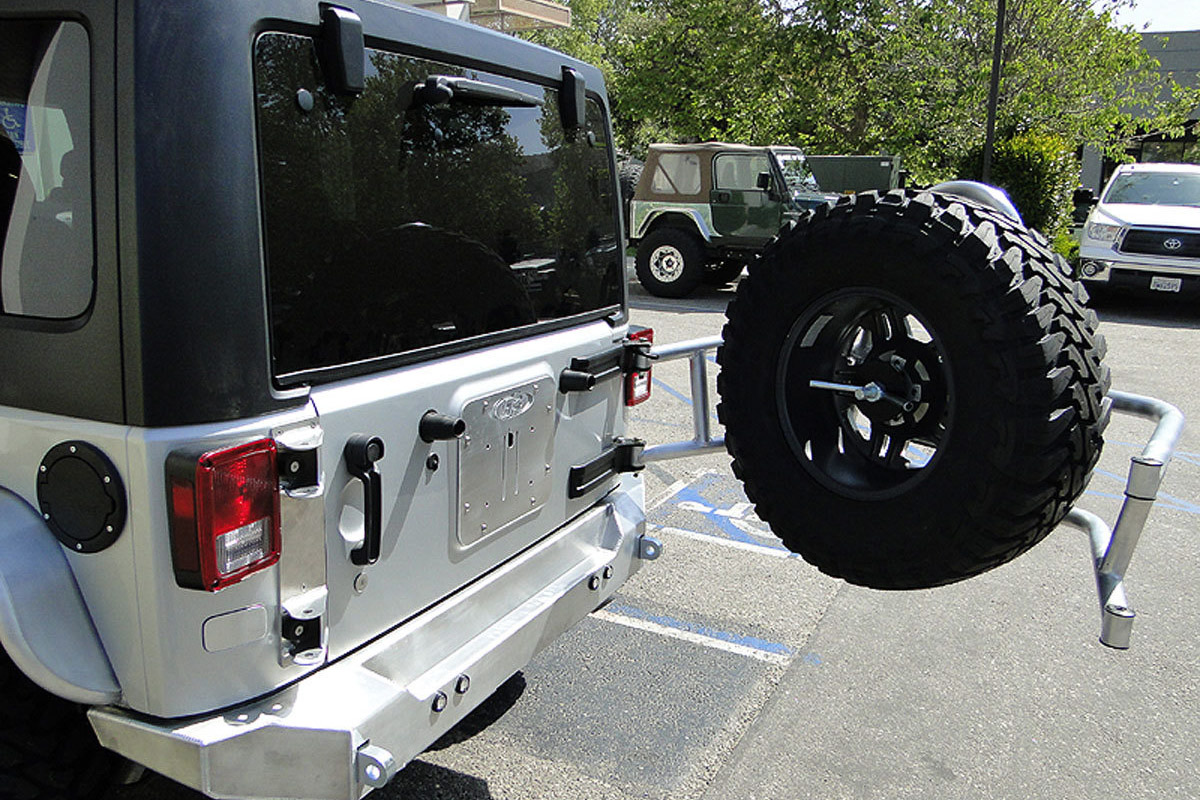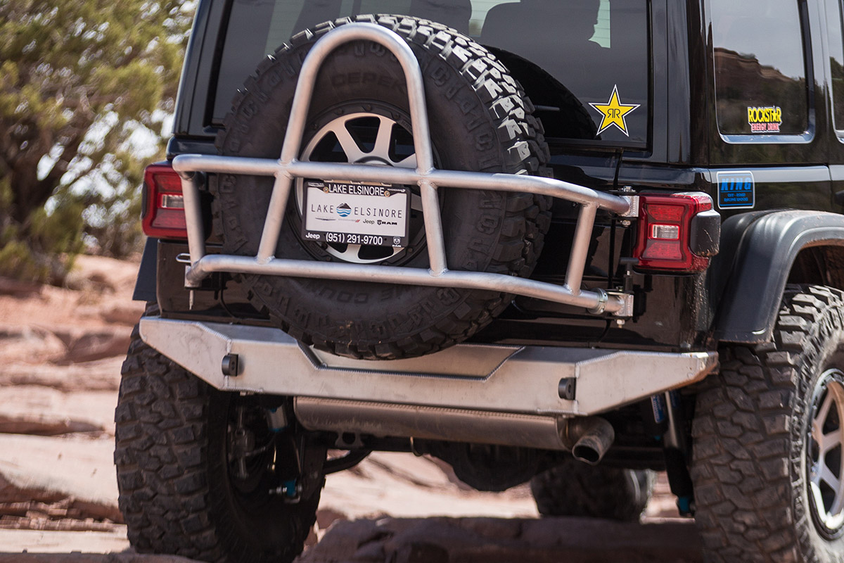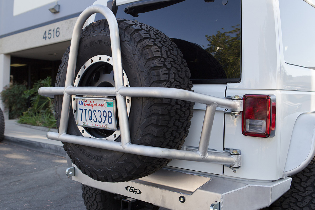 The new tire carrier is the largest and coolest of these three new parts. Rather than being built from heavy steel tubing, it’s built from 6061-T6 aluminum tubing, which saves a huge amount of weight. Considering how often you will be moving the tire carrier to access the trunk, making it as easy as possible to open is important. With a four-point polyurethane mounting system, this tire carrier is rattle-free and super easy to open. Being completely independent of the rear bumper allows you to pick the rear bumper you’ve always wanted.