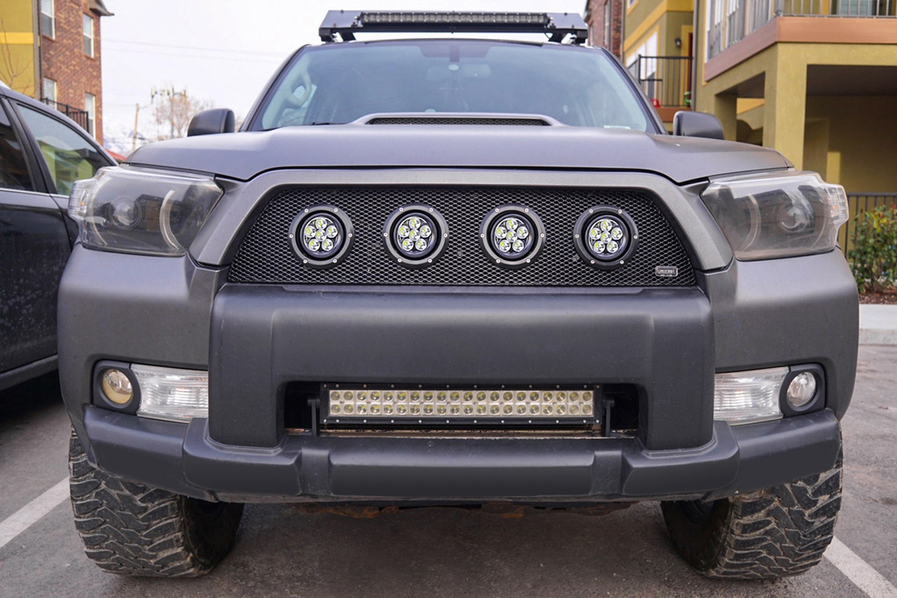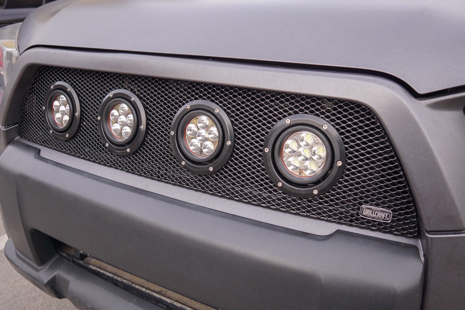 Many off-roaders like to mount their LED light bars on the roof of their 4Runners, but this can create windshield glare. To avoid windshield glare, you can mount your LED light bars farther down, either in the grill or on the bumper. This is where the new Grillcraft XE-Series lighting system comes into play. This kit replaces the factory 4Runner grill with a Grillcraft grill that mounts four small LED light pods. Not only does this look awesome, but it provides a simple way to mount lights on the front of your 4Runner. As you can imagine, this kit is WAY brighter than the OEM headlights on your 4Runner, providing you with enough light to play in the desert all night without any worries.