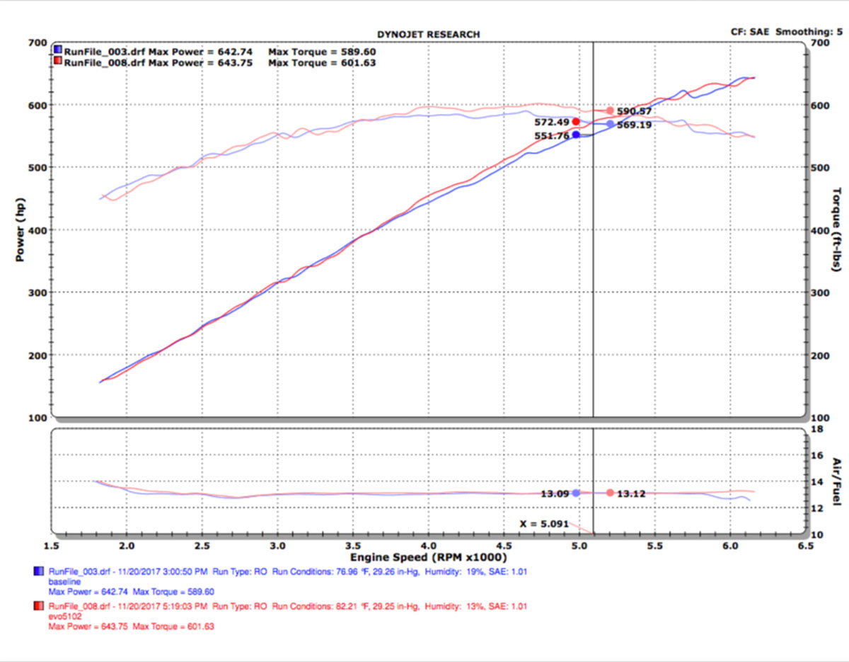 As tested by Injen, this intake gains up to 21 horsepower and 21 ft-lbs. That 21 horsepower isn’t 100% guaranteed due to different ambient temperatures, elevation, heat soak, and other factors, but this intake will definitely increase horsepower in every situation. As you can see from the dyno graph below peak horsepower is pretty much unchanged, but there are noticeable gains in the midrange.