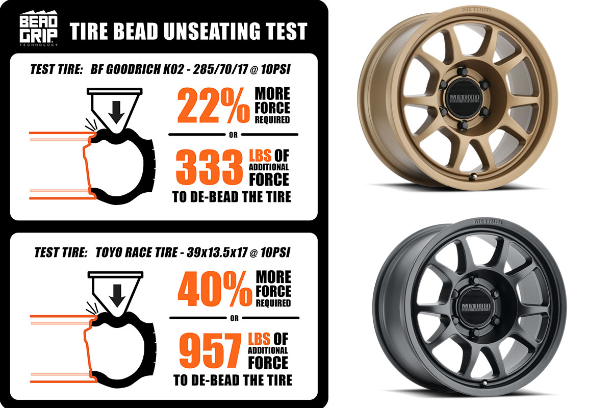 The Trail Series has one main focus: Bead Grip. Traditionally, if you wanted to run very low tire pressures, you needed a bead lock wheel. Bead lock wheels are heavier than standard wheels and much harder to balance, and many bead lock wheels are not DOT legal. The idea of Bead Grip is to provide a strong hold on the bead of the tire without using a bead lock ring. Method does this by using small ridges, which grip the inner and outer tire beat seat, and an aggressive inner safety hump.