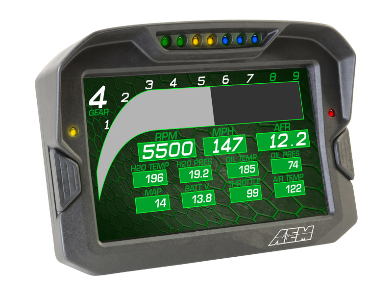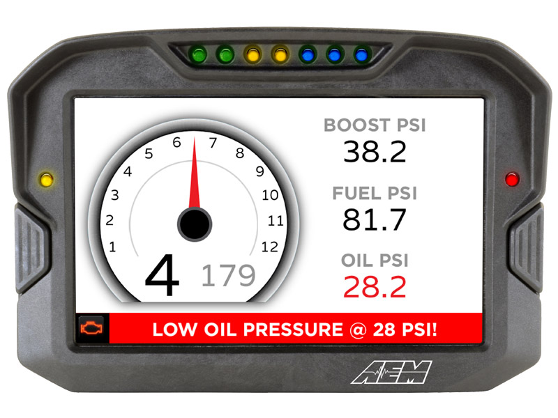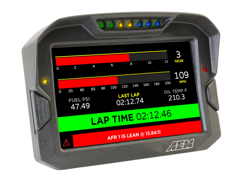 Like the previous CD-7, the CD-7 Carbon requires a single cable for power, ground, and receiving CAN data, making installation much more manageable. If you want to go crazy with your data monitoring, you can add additional sensor data with the AEM 22 Channel CAN Sensor Module. One of the cool features of the CD-7 Carbon dash is the ability to set up custom warnings and alarms. If you’re trying to focus on driving as fast as possible, you might not notice that something is overheating, for example. By setting up a custom alarm, you dash will alert you when something is critically wrong. If multiple things go wrong at once, the CD-7 Carbon dash will scroll through them in order of importance.