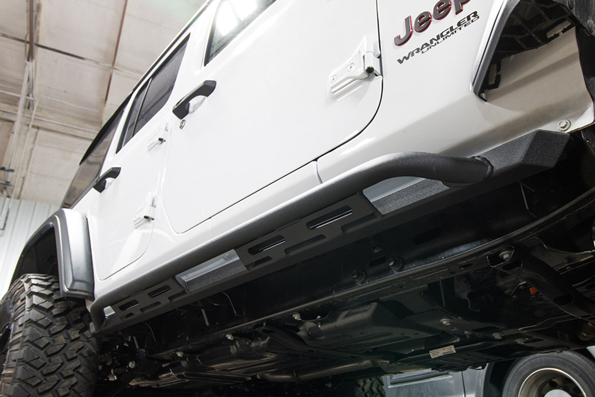 Just like JCR’s other Jeep bumpers, these front bumpers are offered in three different widths: full-width, mid-width, and stubby. Each version of the bumper is available with or without powder-coating and with or without the tubing. The front skid plate is a must-have, especially for Rubicon models because it will protect the electronic sway bar. The sliders are also a must-have, as you don’t want to smash into you rocks and give your Wrangler some body damage. The rear tire carrier is pretty cool, as it allows you to run a larger sized tire on the factory tire carrier with the factory bumper.