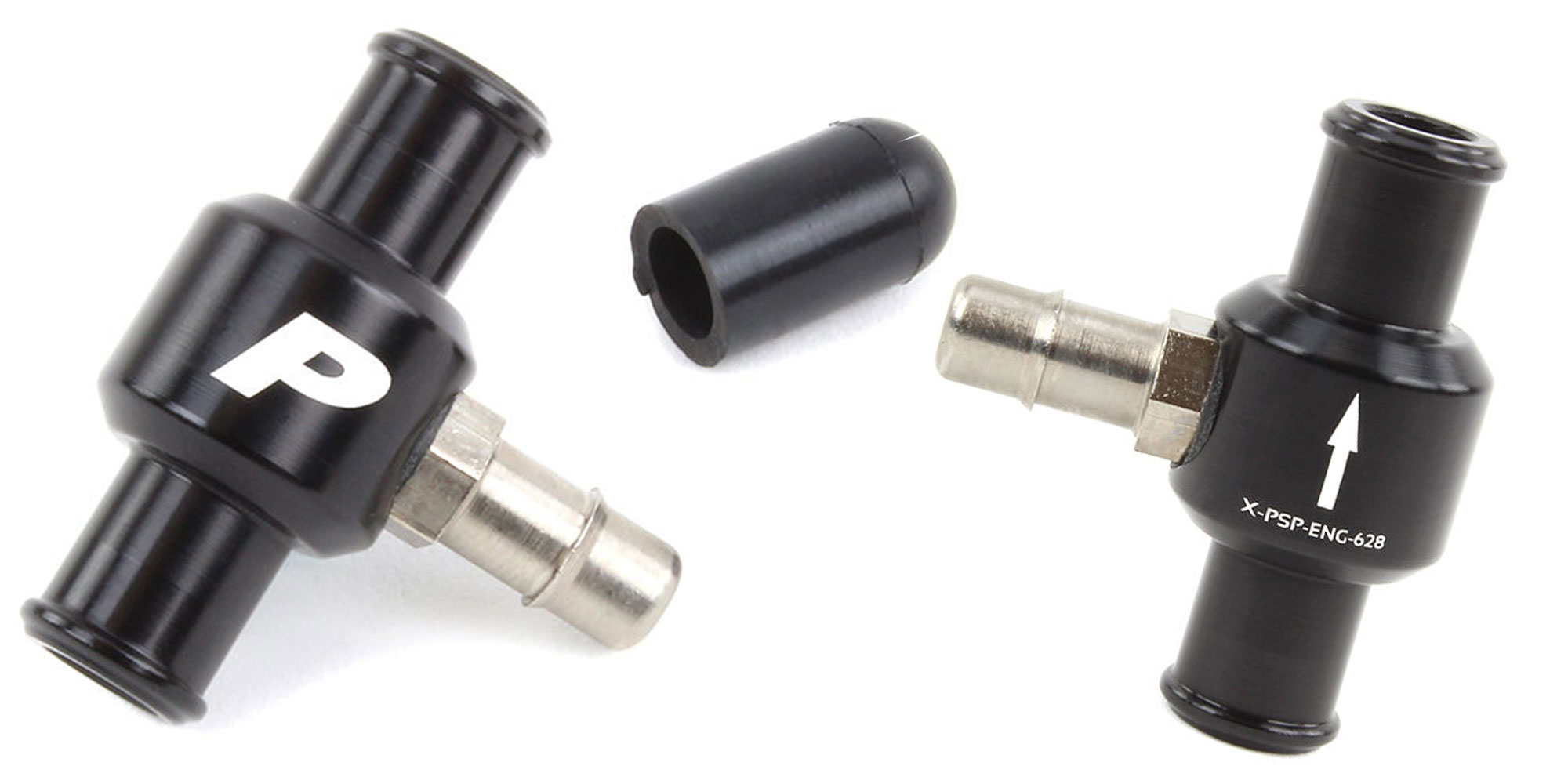 The solution to this problem is to slightly restrict the flow of the turbo sump pump. This creates a slight vacuum on the turbo sump, ultimately balancing out the pressure difference from the aftermarket exhaust. This balance in pressure stops oil from leaking out of the turbo seals and stops the obnoxious oil burning. The part itself is very small and pretty easy to install. Simply cut the OEM rubber line from the turbo sump and install the restrictor.