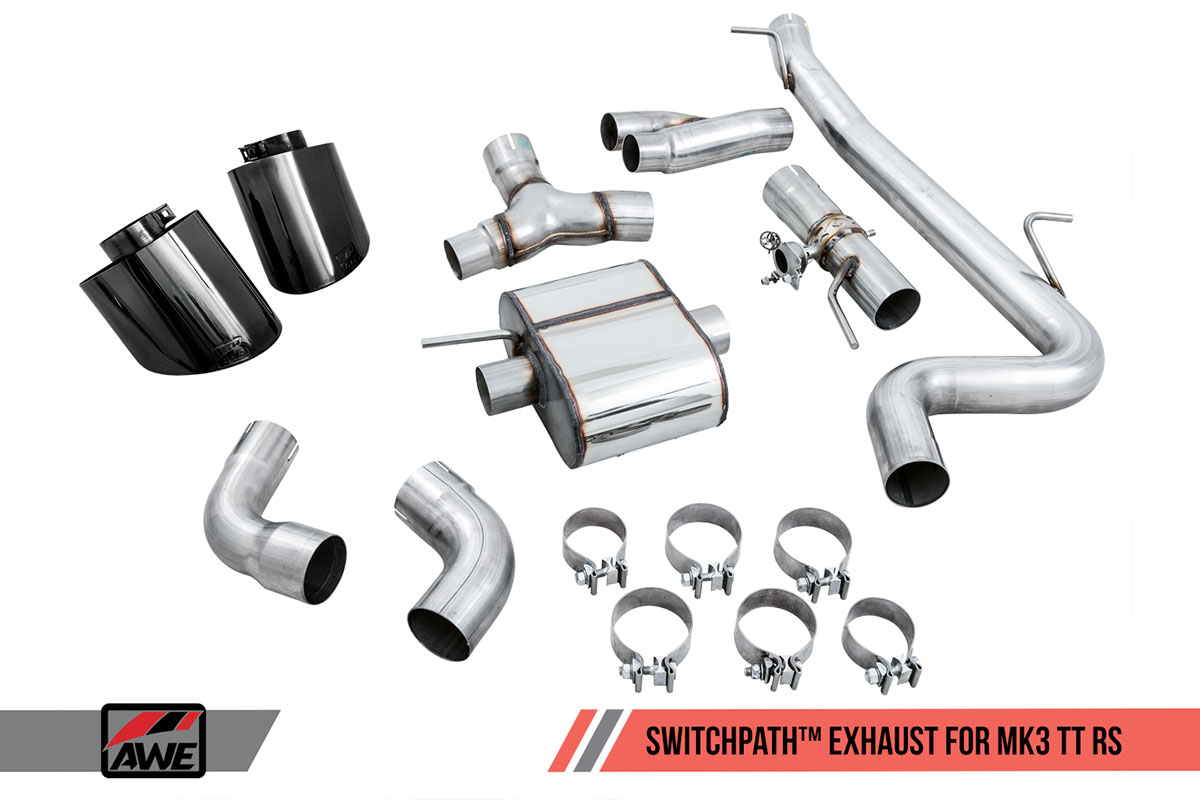 Both the SwitchPath and Track Edition systems are constructed with high-quality 2.5” and 3” mandrel-bent piping. The increase diameter and improved design increases power up 30hp and 7lb-ft, while also saving a massive amount of weight compared to the stock exhaust. The give the TT RS a more aggressive look, AWE includes Diamond Black 180mm RS-Style tips.