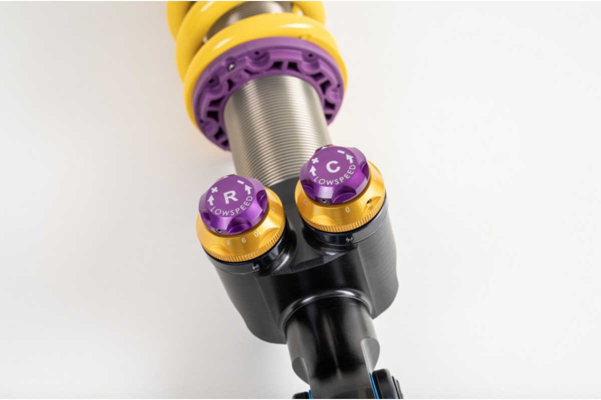 The all-new Variant 5 Coilover package for the Lamborghini Huracan/Spyder spotlights precise 4-way dampening adjustment capabilities, offering 13 clicks of high and low-speed rebound and compression adjustability. High speed refers to suspension travel and events that the coilover itself experiences very quickly like sharp corners or hard launches from a standstill. Low-speed events are suspension movements that happen more gradually like large sweeping corners or steady acceleration.